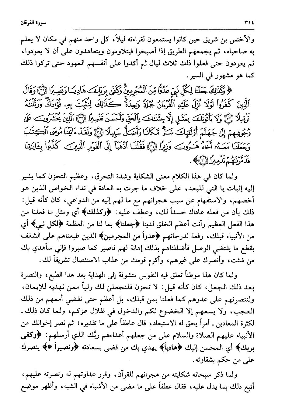) وَكَذَلِكَ جَعَلْنَا لِكُلِّ نَبِيٍّ عَدُوّاً مِّنَ الْمُجْرِمِينَ وَكَفَى بِرَبِّكَ هَادِياً وَنَصِيراً وَقَالَ الَّذِينَ كَفَرُواْ لَوْلاَ نُزِّلَ عَلَيْهِ الْقُرْآنُ جُمْلَةً وَاحِدَةً كَذَلِكَ لِنُثَبِّتَ بِهِ فُؤَادَكَ وَرَتَّلْنَاهُ تَرْتِيلاً وَلاَ يَأْتُونَكَ بِمَثَلٍ إِلاَّ جِئْنَاكَ بِالْحَقِّ وَأَحْسَنَ تَفْسِيراً الَّذِينَ يُحْشَرُونَ عَلَى وُجُوهِهِمْ إِلَى جَهَنَّمَ أُوْلَئِكَ شَرٌّ مَّكَاناً وَأَضَلُّ سَبِيلاً وَلَقَدْ آتَيْنَا مُوسَى الْكِتَابَ وَجَعَلْنَا مَعَهُ أَخَاهُ هَارُونَ وَزِيراً فَقُلْنَا اذْهَبَآ إِلَى الْقَوْمِ الَّذِينَ كَذَّبُواْ بِآيَاتِنَا فَدَمَّرْنَاهُمْ تَدْمِيراً ( ( )