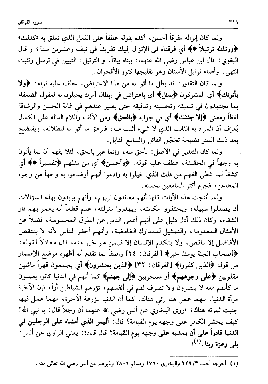 [ الفرقان : 32 ] ) ألذين يحشرون ( اي يجمعون قهراً ماشين مقلوبين ) علةى وجوههم ( أو مسحوبين ) إلى جهنم ( كما أنهم في الدنيا كانوا يعملون ما كأنهم معه لا يبصرون ولا تصرف لهم في أنفسهم ، تؤزهم الشياطين أزاً ، فإن الآخرة مرآة الدنيا ، مهما عمل هنا رئي هناك ، كما أن الدنيا مزرعة الآخرة ، مهما عمل فيها جنيت ثمرته هناك ( روى البخاري عن أنس رضي الله عنهما أن رجلاً قال : يا نبي الله كيف يحشر الكفر على وجهه يوم القيامة ؟ قال : ( أليس الذي أمشاه على الرجلين في الدنيا قادراً على أن يمشيه على ةجهه يوم القيامة ؟ ( قال قتادة : يعني الراوي عن أنس : ( بلى وعزة ربنا .