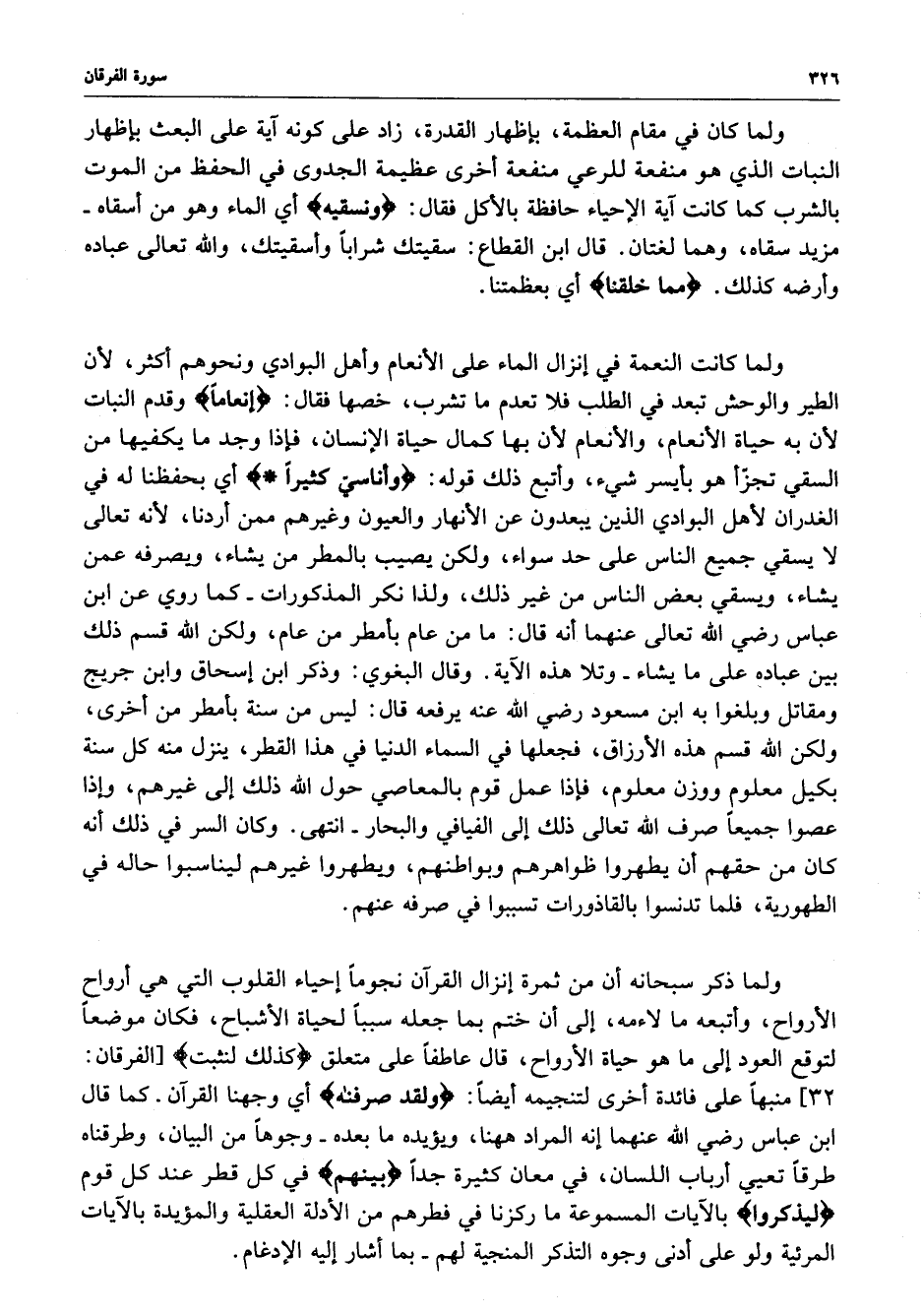 ولما كانت النعمة في إنزال الماء على الأنعام وأهل البوادي ونحوهم أكثر ، لأن الطير والوحش تبعد في الطلب فلا تعدم ما تشرب ، خصها فقال : ( إنعاماً ( وقدم النبات لأن به حياة الأنعام ، والأنعام لأن بها كمال حياة الإنسان ، فإذا وجد ما يكفيها من السقي تجزّأ هو بأيسر شيء ، وأتبع ذلك قوله : ( وأناسيّ كثيراً ) أي بحفظنا له في الغدران لأهل البوادي الذين يبعدن عن الأنهار والعيون وغيرهم ممن أردنا ، لأنه تعالى لا يسقي جميع الناس على حد سواء ، ولكن يصيب بالمطر من يشاء ، ويصرفه عمن يشاء ، ويسقي بعض الناس من غير ذلك ، ولذا نكر المذكورات - كما روي عن ابن عباس رضي الله تعالى عنهما أنه قال : ما من عام بأمطر من عام ، ولكن الله قسم ذلك بين عباده علىما يشاء - وتلا هذه الآية .
