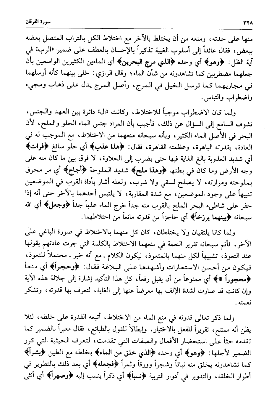 منها على حدته ، ومنعه من أن يختلط بالآخر مع اختلاط الكل بالتراب المتصل بعضه ببعض ، فقال عائداً إلى اسلوب الغيبة تذكيراً الإحسان بالعطف على ضمير ( الرب ) في آية الظل : ( وهو ) أي وحده ) الذي مرج البحرين ) أي الماءين الكثيرين الواسعين بأن جعلهما مضطربين كما تشاهدونه من شأن الماء ؛ وقال الرازي : خلى بينهما كأنه أرسلهما في مجاريهما كما ترسل الخيل في المرج ، وأصل المرج يدل على ذهاب ومجيء واضطراب والتباس .