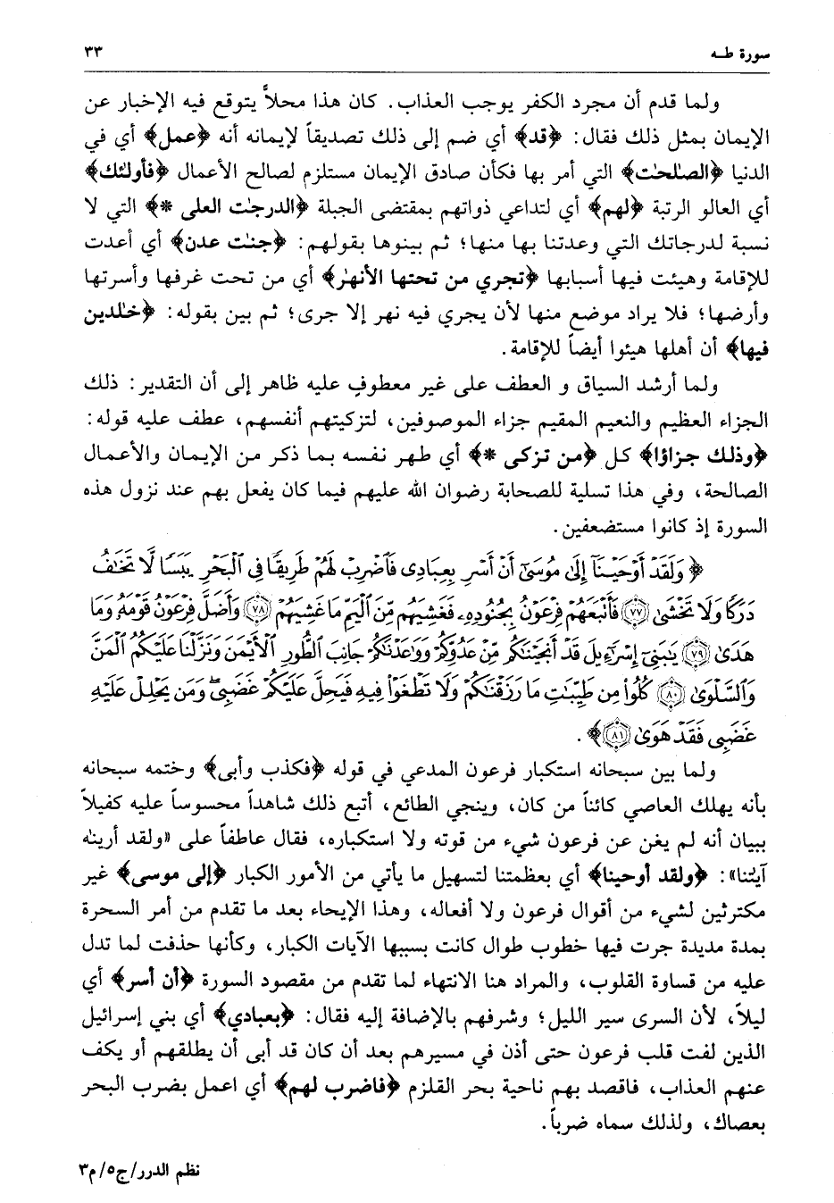 ) وَلَقَدْ أَوْحَيْنَآ إِلَى مُوسَى أَنْ أَسْرِ بِعِبَادِي فَاضْرِبْ لَهُمْ طَرِيقاً فِي الْبَحْرِ يَبَساً لاَّ تَخَافُ دَرَكاً وَلاَ تَخْشَى فَأَتْبَعَهُمْ فِرْعَوْنُ بِجُنُودِهِ فَغَشِيَهُمْ مِّنَ الْيَمِّ مَا غَشِيَهُمْ وَأَضَلَّ فِرْعَوْنُ قَوْمَهُ وَمَا هَدَى يبَنِي إِسْرَائِيلَ قَدْ أَنجَيْنَاكُمْ مِّنْ عَدُوِّكُمْ وَوَاعَدْنَاكُمْ جَانِبَ الطُّورِ الأَيْمَنَ وَنَزَّلْنَا عَلَيْكُمُ الْمَنَّ وَالسَّلْوَى كُلُواْ مِن طَيِّبَاتِ مَا رَزَقْنَاكُمْ وَلاَ تَطْغَوْاْ فِيهِ فَيَحِلَّ عَلَيْكُمْ غَضَبِي وَمَن يَحْلِلْ عَلَيْهِ غَضَبِي فَقَدْ هَوَى ( ( )