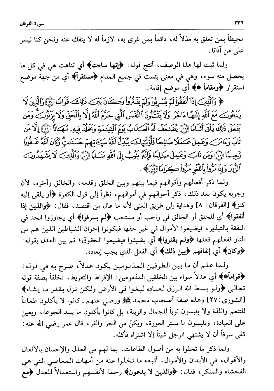 ولما علم أن ما بين الطرفين المذمومين يكون عدلاً ، صرح به في قوله : ( قواماً ) أي عدلاً سواء بين الخلقين المذمومين : الإفراط والتفريط ، تخلقاً بصفة قوله تعالى ) ) ولو بسط الله الرزق لعباده لبغوا في الأرض ولكن نزل بقدر ما يشاء ( ) [ الشورى : 27 ] وهذه صفة أصحاب محمد صلى الله عليه و رضي عنهم - كانوا لا يأكلون طعاماً للتنعم واللذة ولا يلبسون ثوباً للجمال والزينة ، بل كانوا يأكلون ما يسد الجوعة ، ويعين على العبادة ، ويلبسون ما يستر العورة ، ويكنّ ن الحر والقر ، قال عمر رضي الله عنه : كفى سرفاً أن لا يشتهي الرجل شيئاً إلا اشتراه فأكله .