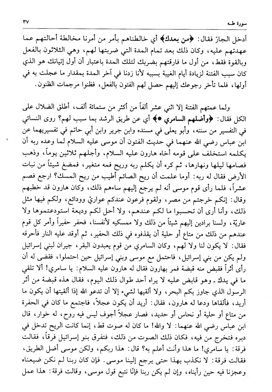 ولما عمتهم الفتنة إلا اثني عشر ألفاً من أكثر من ستمائة ألف ، أطلق الضلال على الكل فقال : ( وأضلهم السامري ) أي عن طريق الرشد بما سبب لهم ؟ روى النسائي في التفسير من سننه ، وأبو يعلى في مسنده وابن جرير وابن أبي حاتم في تفسيرههما عن ابن عباس رضي الله عنهما في حديث الفتون أن موسى عليه السلام لما وعده ربه أن يكلمه استخلف على قومه أخاه هارون عليه السلام ، وأجلهم ثلاثين يوماً ، وذهب فصامها ليلها ونهارها ، ثم كره أن يكلم ربه وريح فمه متغير ، فمضغ شيئاً من نبات الأرض فقال له ربه : أوما علمت أن ريح الصائم أطيب من ريح ا لمسك ؟ ارجع فصم عشراً ، فلما رأى قوم موسى أنه لم يرجع إليهم ساءهم ذلك ، كان هارون قد خطبهم وقال : إنكم خرجتم من مصر ، ولقوم فرعون عواريّ وودائع ، ولكم فيها مثل ذلك ، وأنا أرى أن تحسبوا ما لكم عندهم ، ولا أحل لكم وديعة استودعتموها ولا عاريّة ، ولسنا براين إليهم شيئاً من ذلك ولا ممسكيه لأنفسنا ، فحفر حفيراً وأمر كل قوم عندهم من ذلك من متاع أو حلية أن يقذفوه في ذلك الحفير ، ثم أوقد النار فأحرقه فقال : لا يكون لنا ولا لهم ، وكان السامري من قوم يعبدون البقر ، جيران لبني اسرائيل ولم يكن من بني إسرائيل ، فاحتمل مع موسى وبني إسرائيل حين احتمالوا ، فقضى له أن رأى أثراً فقبض منه قبضة فمر بهارون فقال له هارون عليه السلام : يا سامري ألا تلقي ما في يدك - وهو قابض عليه لا يراه أحد طوال ذلك اليوم ، فقال هذه قبضة من أثر الرسول الذي جاوز بكم البحر ، ولا ألقيها لشيء إلا أن تدعو الله إذا ألقيتها أن يكون ما أريد ، فألقاها ودعا له هارون ، فقال : أريد أن يكون عجلاً ، فاجتمع ما كان في الحفرة من متاع أوحلية أو نحاس أوحديد ، فصار عجلاً أحوف ليس فيه الروح ، له خوار ، قال ابن عباس رضي الله عنهما : لا والله ما كان له صوت قط ، إنما كانت الريح تدخل في دبره فتخرج من فيه ، فكان ذلك الصوت من ذلك ، فتفرق بنو إسرائيل فرقاً ، فقالت فرقة : ياسامري ما هذا وأنت أعلم به ؟ قال : هذا ربكم ، ولكن موسى أضل الطريق ، فقالت فرقة : لانكذب بهذا حتى يرجع إلينا موسى .