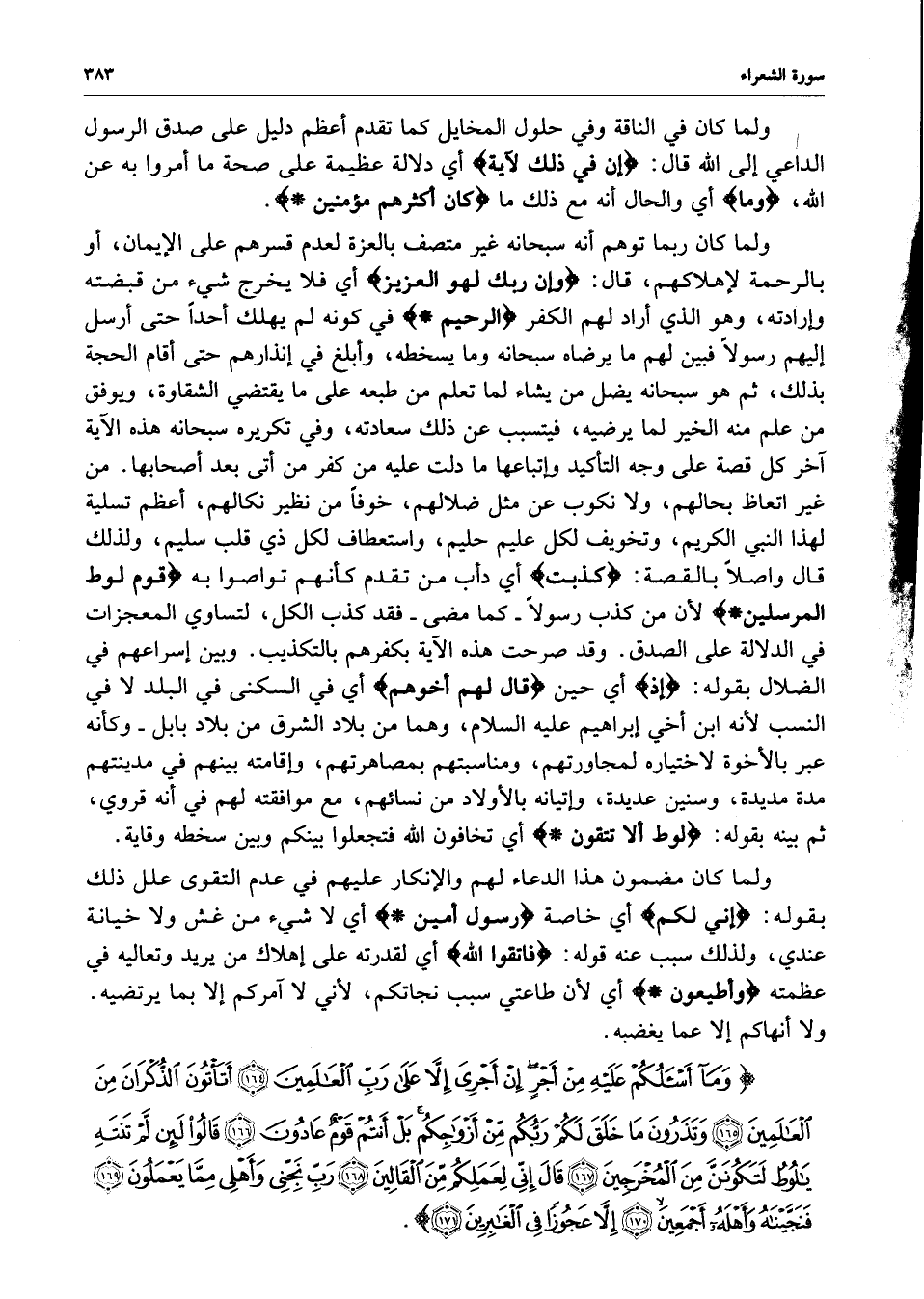 ) وَمَآ أَسْأَلُكُمْ عَلَيْهِ مِنْ أَجْرٍ إِنْ أَجْرِيَ إِلاَّ عَلَى رَبِّ الْعَالَمِينَ أَتَأْتُونَ الذُّكْرَانَ مِنَ الْعَالَمِينَ وَتَذَرُونَ مَا خَلَقَ لَكُمْ رَبُّكُمْ مِّنْ أَزْوَاجِكُمْ بَلْ أَنتُمْ قَوْمٌ عَادُونَ قَالُواْ لَئِن لَّمْ تَنتَهِ يلُوطُ لَتَكُونَنَّ مِنَ الْمُخْرَجِينَ قَالَ إِنِّي لِعَمَلِكُمْ مِّنَ الْقَالِينَ رَبِّ نَّجِنِي وَأَهْلِي مِمَّا يَعْمَلُونَ فَنَجَّيْنَاهُ وَأَهْلَهُ أَجْمَعِينَ إِلاَّ عَجُوزاً فِي الْغَابِرِينَ ( ( )