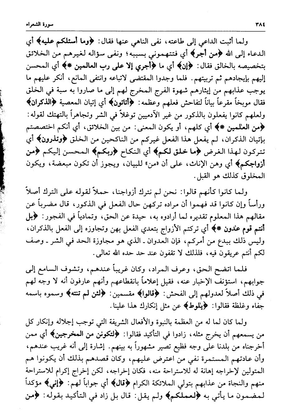 فلما وجدوا المتقضي لاتباعه وانتفى المانع ، أنكر عليهم ما يوجب عذابهم من إيثارهم شهوة الفرج المخرج لهم إلى ما صاروا به سبة في الخلق فقال موبخاُ مقرعاً بياناً لتفاحش فعلهم وعظمة : ( أتاتون ( اي إتيان المعصية ) الذكران ( ولعلهم كانوا يفعلون بالذكور من غير الآدميين توغلاً في الشر وتجاهراً بالتهتك لقوله : ( من العالمين ) أي كلهم ، أو يكون المعنى : من بين الخلائق ، اي أنكم اختصصتم بإتيان الذكران ، لم يفعل هذا الفعل غيركم من الناكحين من الخلق ) وتذرون ) أي تتركون لهذا الغرض ) ما خلق لكم ) أي النكاح ) ربكم ( المحسن إليكم ) من أزواجكم ) أي وهن الإناث ، على أن ( من ) لبيان ، ويجوز أن تكون مبغضةن ويكون المخلوق كذلك هو القبل .