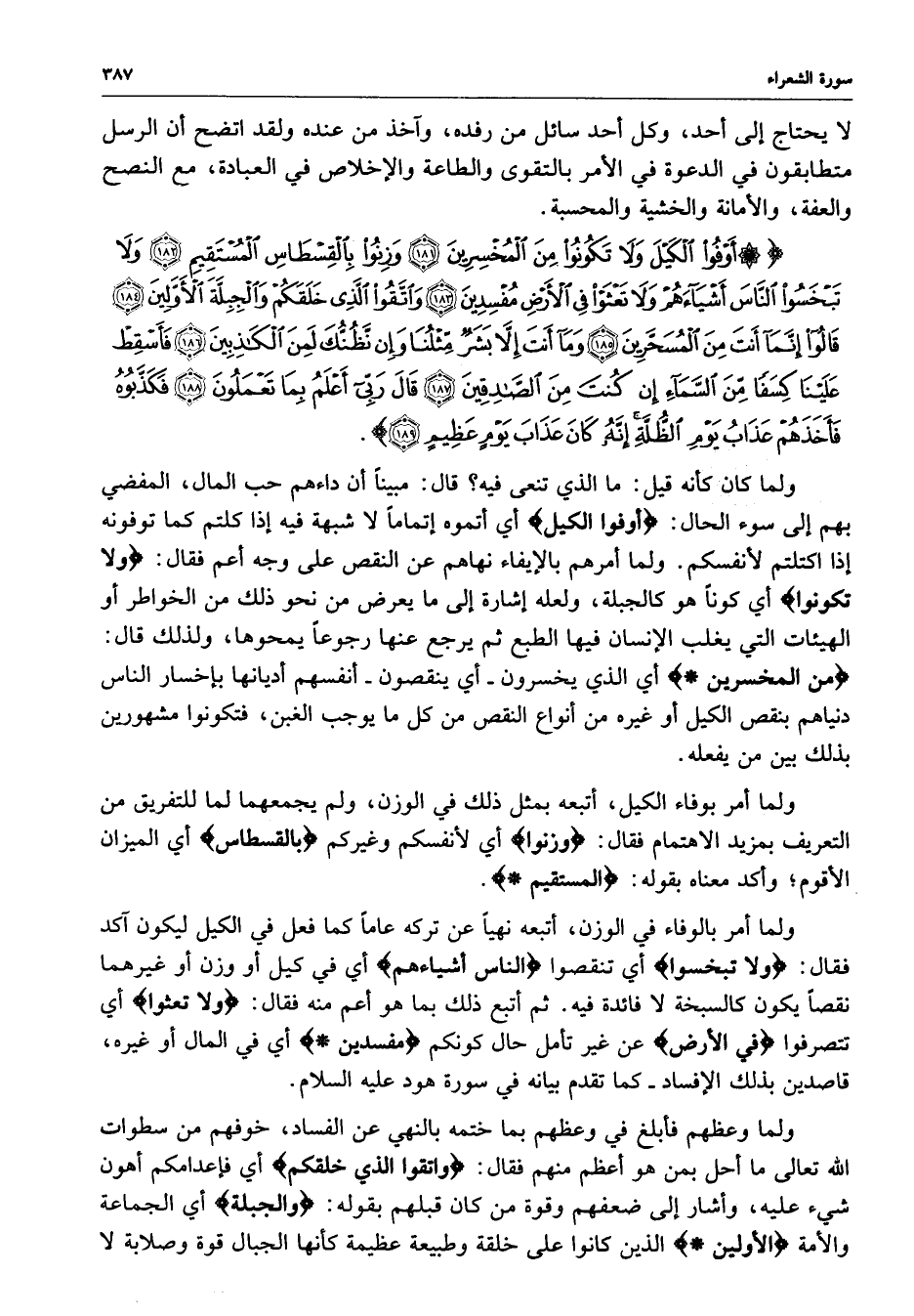 ) أَوْفُواْ الْكَيْلَ وَلاَ تَكُونُواْ مِنَ الْمُخْسِرِينَ وَزِنُواْ بِالْقِسْطَاسِ الْمُسْتَقِيمِ وَلاَ تَبْخَسُواْ النَّاسَ أَشْيَآءَهُمْ وَلاَ تَعْثَوْاْ فِي الأَرْضِ مُفْسِدِينَ وَاتَّقُواْ الَّذِي خَلَقَكُمْ وَالْجِبِلَّةَ الأَوَّلِينَ قَالُواْ إِنَّمَآ أَنتَ مِنَ الْمُسَحَّرِينَ وَمَآ أَنتَ إِلاَّ بَشَرٌ مِّثْلُنَا وَإِن نَّظُنُّكَ لَمِنَ الْكَاذِبِينَ فَأَسْقِطْ عَلَيْنَا كِسَفاً مِّنَ السَّمَآءِ إِن كُنتَ مِنَ الصَّادِقِينَ قَالَ رَبِّي أَعْلَمُ بِمَا تَعْمَلُونَ فَكَذَّبُوهُ فَأَخَذَهُمْ عَذَابُ يَوْمِ الظُّلَّةِ إِنَّهُ كَانَ عَذَابَ يَوْمٍ عَظِيمٍ ( ( )