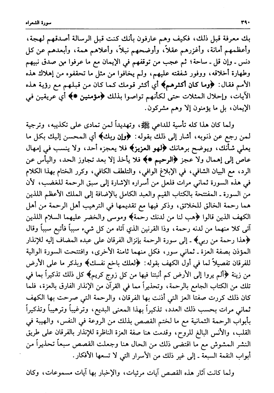 ولما كان هذا كله تأسية للداعي ( صلى الله عليه وسلم ) ، وتهديداً لمن تمادى على تكذيبه ، وترجية لمن رجع عن ذنوبه ، اشار إلى ذلك بقوله : ( وإن ربك ) أي المحسن إليك بكل ما يعلي شأنك ، ويوضح برهانك ) لهو العزيز ( فلا يعجزه أحد ، ولا ينسب في إمهال عاص إلى إهمال ولا عجز ) الرحيم ( فلا يأخذ إلا بعد تجاوز الحد ، واليأس عن الرد ، مع البيان الشافي ، في الإبلاغ الوافي ، والتلطف الكافي ، وكرر الختام بهذا الكلام في هذه السورة ثماني مرات فلعل من أسراره الإشارة إلى سبق الرحمة للغضب ، لأن من السورة - المفتتحة بالكتاب القيم والعبد الكامل بالإضافة إلى الملك الأعظم اللذين هما رحمة الخالق للخلائق ، وذكر فيها مع تقديمها في الترهيب أهل الرحمة من أهل الكهف الذين قالوا ) هب لنا من لدنك رحمة ( وموسى والخضر عليهما السلام اللذين آتى كلا منهما من لدنه رحمة ، وذا القرنين الذي آتاه من كل شيء سبباً فأتبع سبباً وقال ) هذا رحمة من ربي ( - إلى سورة الرحمة بإنزال الفرقان على عبده المضاف إليه للإنذار المؤذن بصفة العزة - ثماني سور ، فكل منهما ثامنة الأخرى ، وافتتحت السورة الوالية للفرقان تفصيلاً لما في أول الكهف بقوله : ( لعلك باخع نفسك ( وبذكر ما على الأرض نم زينة ) ألم يروا إلى الأرض كم أنبتنا فيها من كل زوج كريم ( كل ذلك تذكيراً بما في تلك من الكتاب الجامع بالرحمة ، وتحذيراً مما في القرآن من الإنذار الفارق بالعزة ، فلما كان ذلك كررت صفتا العز التي أذنت بها الفرقان ، والرحمة التي صرحت بها الكهف ثماني مرات بحسب ذلك العدد ، تذكيراً بهذا المعنى البديع ، وترغيباً وترهيباً وتذكيراً بأبواب الرحمة الثمانية مع ما لختم القصص بذلك من الروعة في النفس ، والهيبة في القلب ، والأنس البالغ للروح ، وقدمت هنا صفة العزة الناظرة للإنذار بالفرقان على طريق النشر المشوش مع ما اقتض ذلك من الحال هنا وجعلت القصص سبعاً تحذيراً من أبواب النقمة السبعة - إلىغير ذلك من الأسرار التي لا تسعها الأفكار .