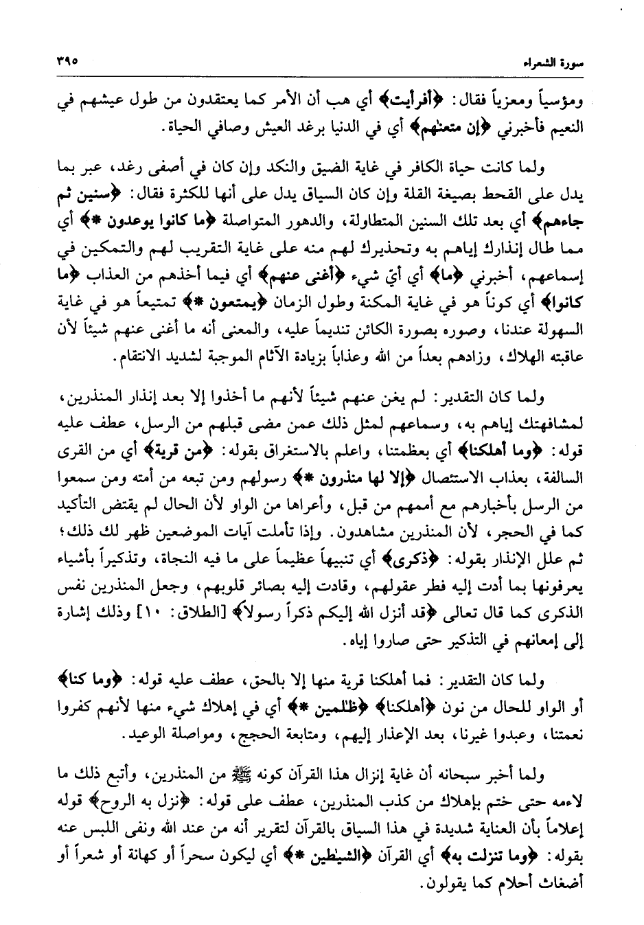 ولما أخبر سبحانه أن غاية إنزال هذا القرآن كونه ( صلى الله عليه وسلم ) من المنذرين ، وأتبع ذلك ما لاءمه حتى ختم بإهلاك من كذب المنذرين ، عطف على قوله : ( نزل به الروح ( قوله إعلاماً بأن العناية شديدة في هذا السياق بالقرآن لتقرير أنه من عند الله ونفى اللبس عنه بقوله : ( وما تنزلت به ) أي القرآن ) الشياطين ) أي ليكون سحراً أو كهانة أو شعراً أو أضغاث أحلام كما يقولون .