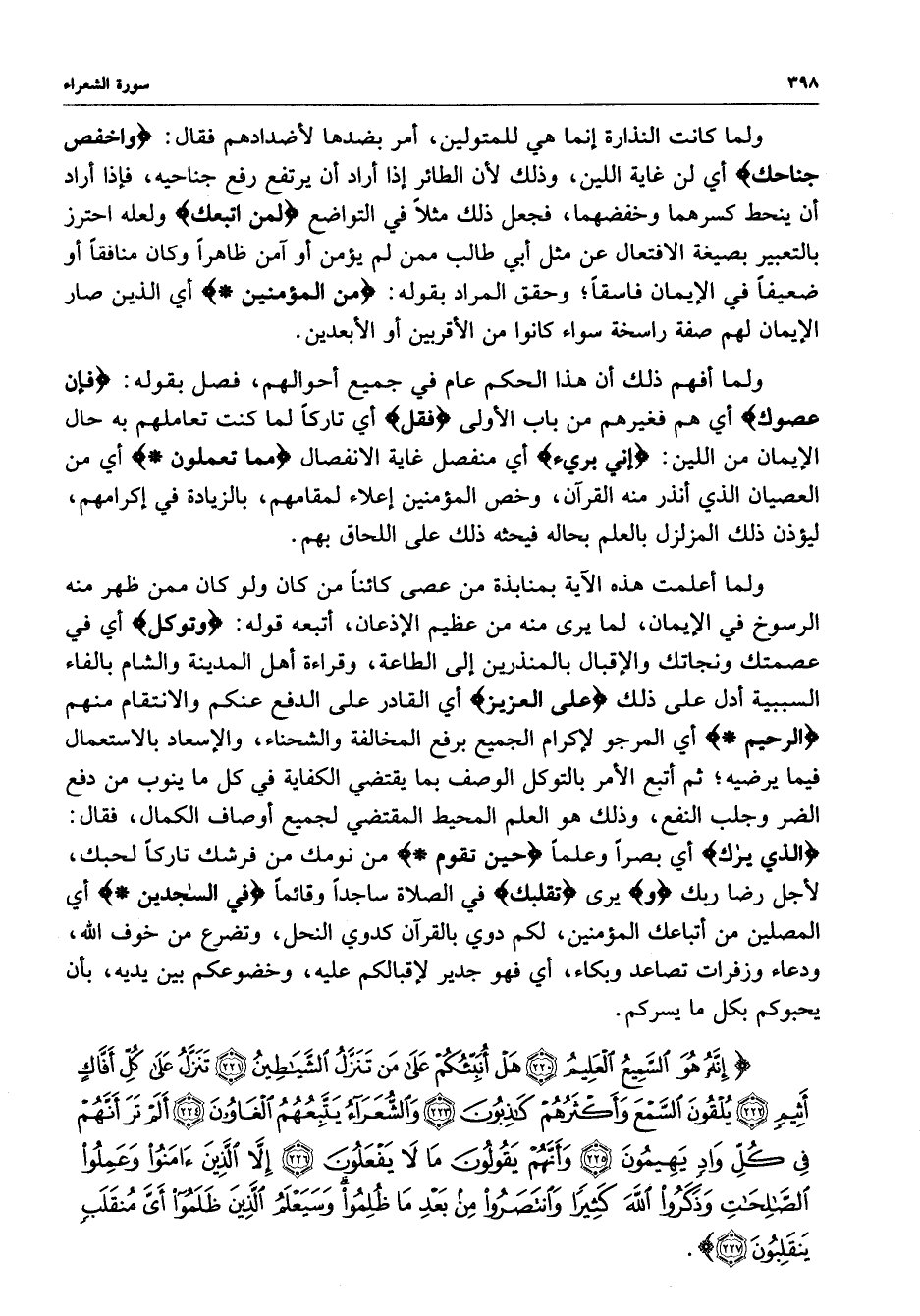 ) إِنَّهُ هُوَ السَّمِيعُ الْعَلِيمُ هَلْ أُنَبِّئُكُمْ عَلَى مَن تَنَزَّلُ الشَّيَاطِينُ تَنَزَّلُ عَلَى كُلِّ أَفَّاكٍ أَثِيمٍ يُلْقُونَ السَّمْعَ وَأَكْثَرُهُمْ كَاذِبُونَ وَالشُّعَرَآءُ يَتَّبِعُهُمُ الْغَاوُونَ أَلَمْ تَرَ أَنَّهُمْ فِي كُلِّ وَادٍ يَهِيمُونَ وَأَنَّهُمْ يَقُولُونَ مَا لاَ يَفْعَلُونَ إِلاَّ الَّذِينَ آمَنُواْ وَعَمِلُواْ الصَّالِحَاتِ وَذَكَرُواْ اللَّهَ كَثِيراً وَانتَصَرُواْ مِن بَعْدِ مَا ظُلِمُواْ وَسَيَعْلَمْ الَّذِينَ ظَلَمُواْ أَيَّ مُنقَلَبٍ يَنقَلِبُونَ ( ( )