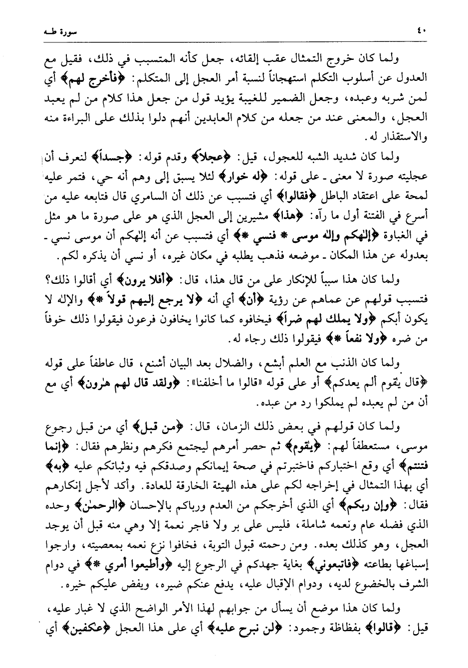 ولما كان شديد الشبه للعجول ، قيل : ( عجلاً ( وقدم قوله : ( جسداً ( لنعرف أن عجليته صورة لا معنى - على قوله : ( له خوار ( لئلا يسبق إلى وهم أنه حي ، فتمر عليه لمحة على اعتقاد الباطل ) فقالوا ) أي فتسبب عن ذلك أن السامري قال فتابعه عليه من أسرع في الفتنة أول ما رآه : ( هذا ( مشرين إلى العجل الذي هو على صورة ما هو مثل في الغباوة ) إلهكم وإله موسى فنسى ( اي فتسبب عن أنه إلهكم أن موسى نسي - بعدوله عن هذا المكان - موضعه فذهب يطلبه في مكان غيره ، أو نسي أن يذكره لكم .