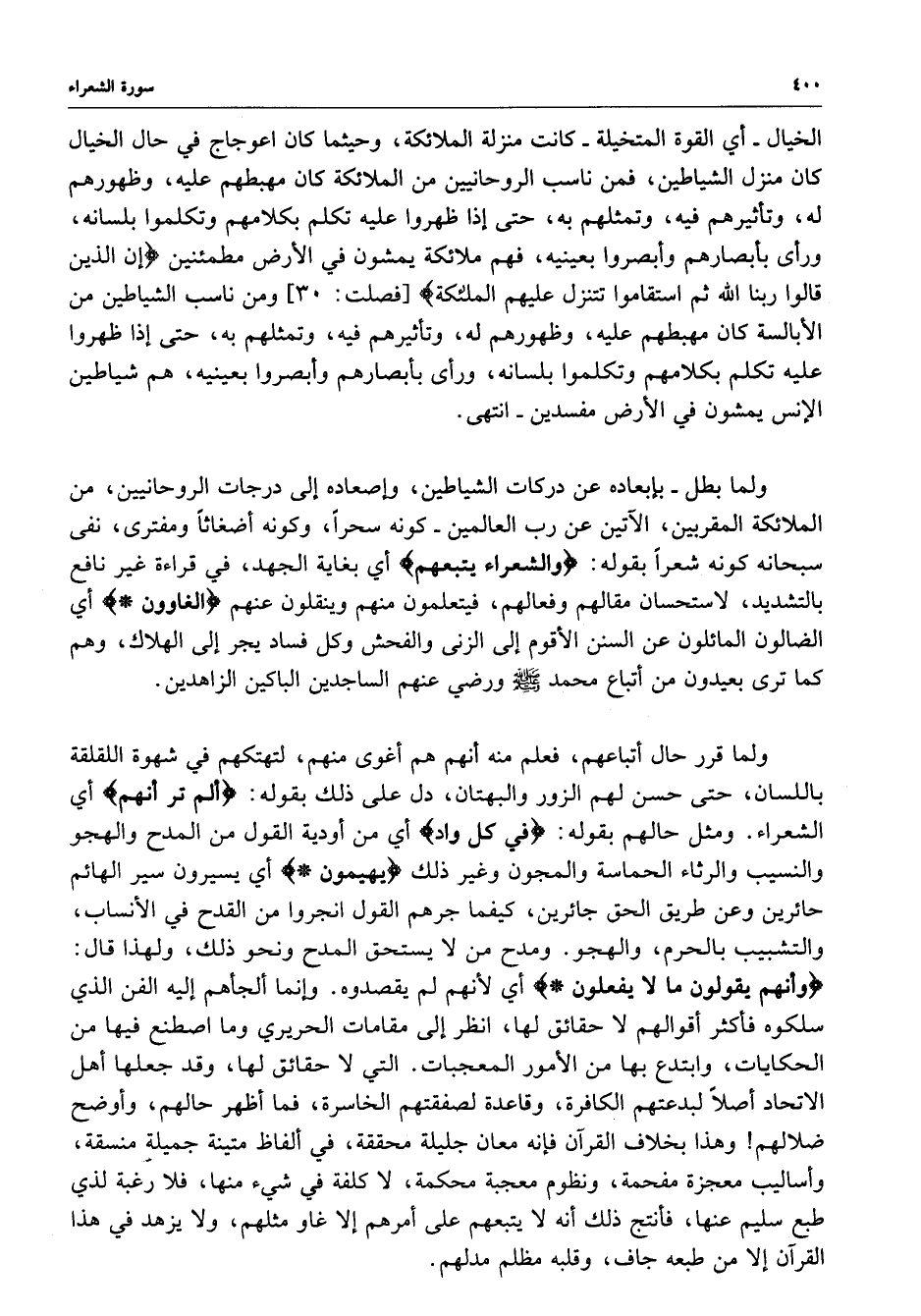 التي لا حقائق لها ، وقد جعلها أهل الاتحاد أصلاً لبدعتهم الطافرة ، وقاعدة لصفقتهم الخاسرة ، فنا أظهر حالهم ، وأوضح ضلالهم وهذا بخلاف القرن فإن معان جليلة محققة ، في ألفاظ متينة جميلة منسقة ، وأساليب معجزة مفحمة ، ونظوم معجبة محكمة ، لا كلفة في شيء منها ، فلا رغبة لذي طبع سليم عنها ، فأنتج ذلك أنه لا يتبعهم على أمرهم إلا غاو مثلهم ، ولا يزهد في هذا القرآن إلا من طبعه جاف ، زقلبه مظلم مدلهم .