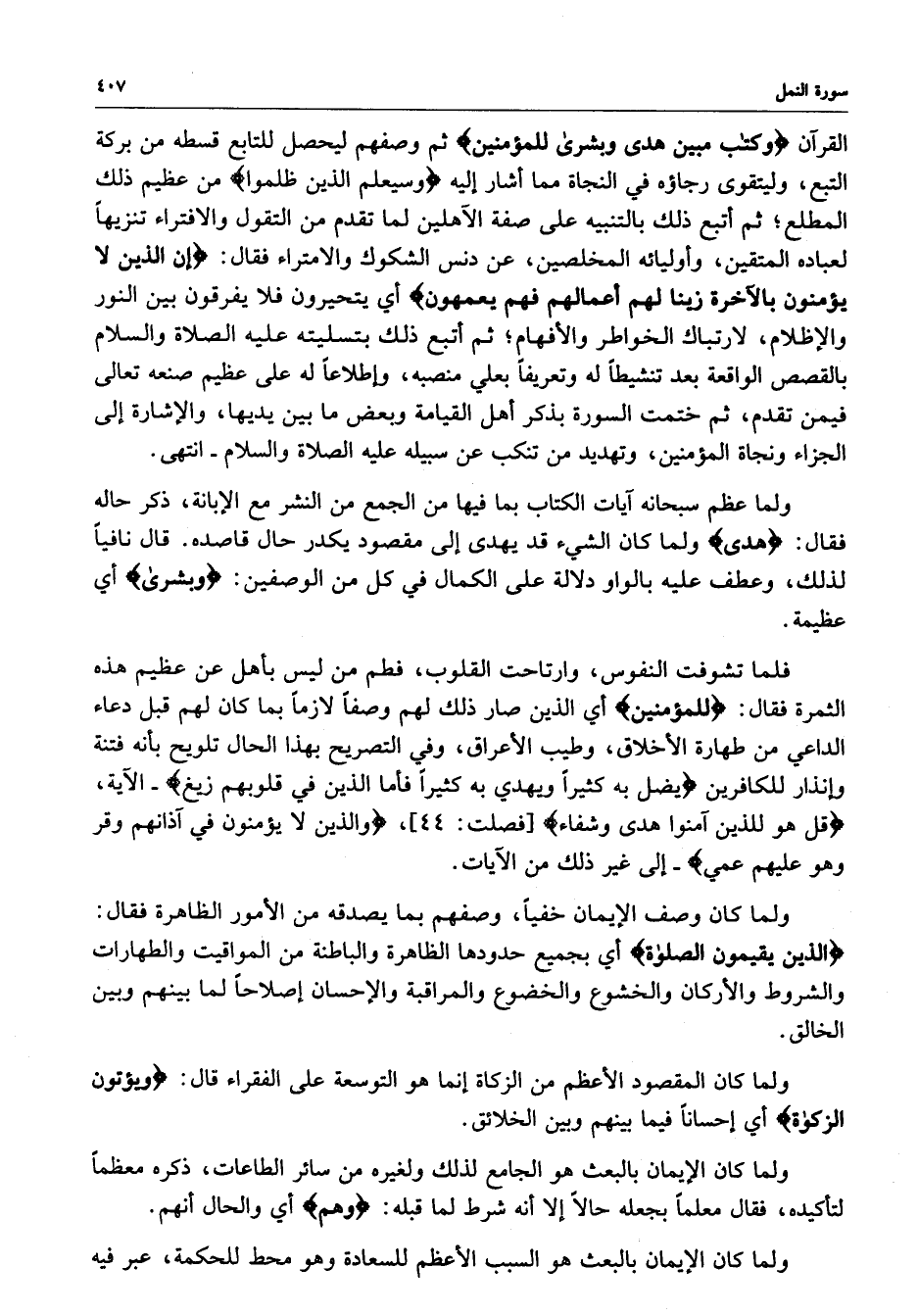 القرآن ) وكتاب مبين هدى وبشر للمؤمنين ( ثم وصفهم ليحصل للتابع قسطه من بركة التبع ، وليتقوى رجاؤه في النجاة مما اشار إليه ) وسيعلم الذين ظلموا ( من عظيم ذلك المطلع ؛ ثم اتبع ذلك بالتنبيه على صفة الاهلين لما تقدم من اتلقول والافتراء تنزيهاً لعباده المتقين ، وأوليائه المخلصين ، عن دنس الشكك والامتراء فقال : ( إن الذين لا يؤمنون بالاخرة زينا لهم أعمالهم فهم يعمهون ) أي يتحيرون فلا يفرقون بين النور والإظلام ، لارتباك الخواطر والأفهام ؛ ثم أتبع ذلك بتسليته عليه الصلاة والسلام بالقصص الواقعة بعد تنشيطاً له وتعريفاً بعلي منصبه ، وإطلاعاً له على عظيم صنعه تعالى فيمن تقدم ، ثم ختمت السورة بذكر أهل القيامة وبعض ما بين يديها ، والإشارة إلى الجزاء ونجاة المؤمنين ، وتهديد من تنكب عن سبيله عليه الصلاة والسلام - انتهى .