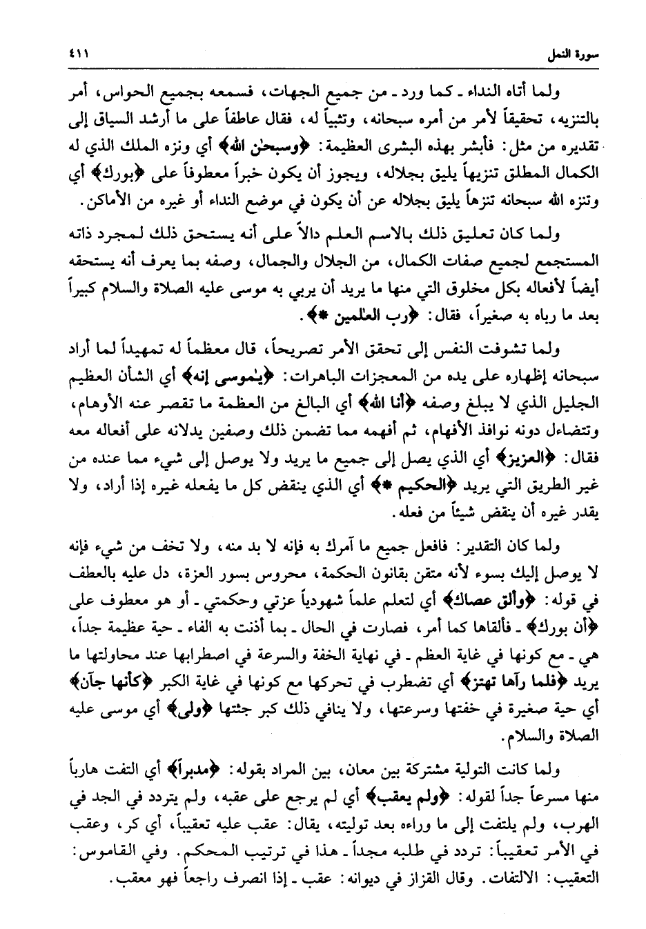 ولما كانت عليه التولية مشتركة بين معان ، بين المراد بقوله : ( مدبراً ( اي التفت هارباً منها مسرعاً جداً لقوله : ( ولم يعقب ( اي لم يرجع على عقبه ، ولم يتردد في الجد في الهرب ، ولم يلتفت إلى ما وراءه بعد توليته ، يقال : عقب عليه تعقيباً ، اي كر ، وعقب في الأمر تعقيباً : تردد في طلبه مجداً - هذا في ترتيب المحكم .