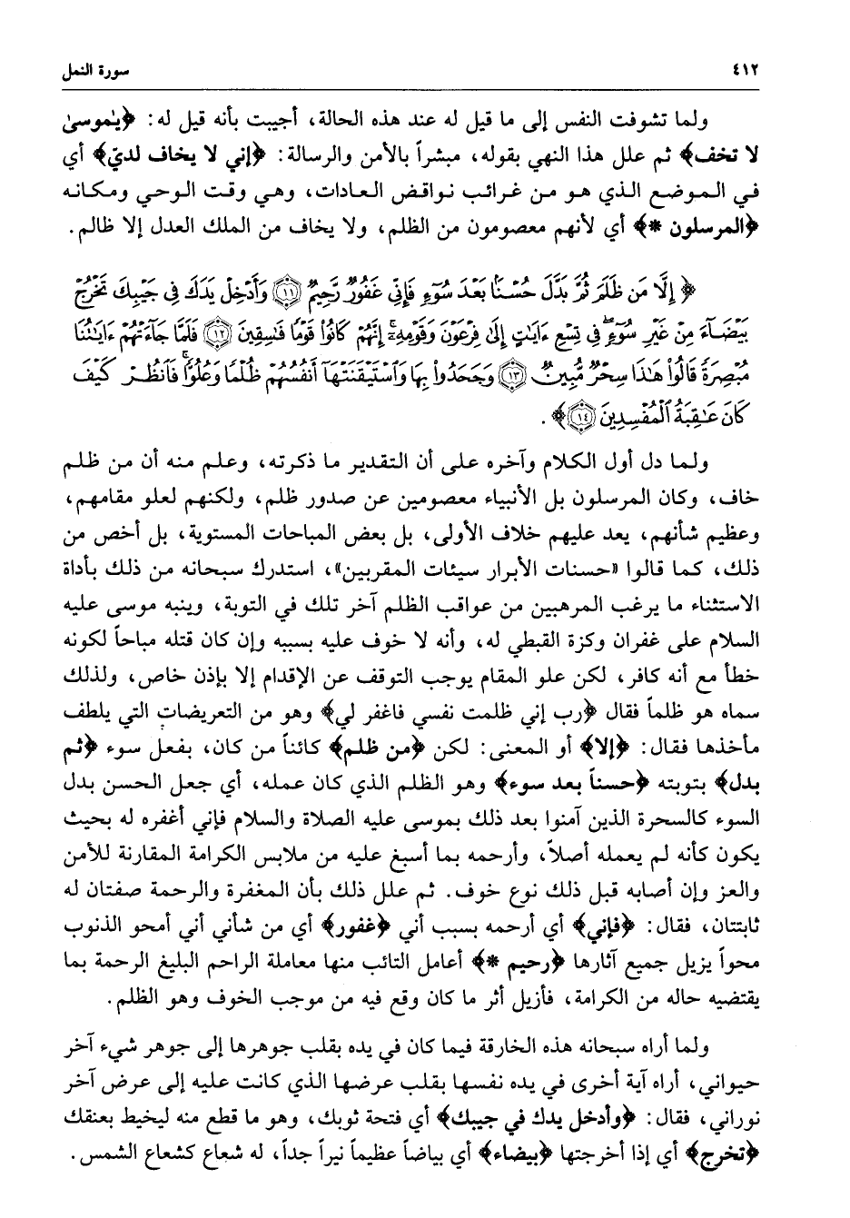 ) إَلاَّ مَن ظَلَمَ ثُمَّ بَدَّلَ حُسْناً بَعْدَ سُوءٍ فَإِنِّي غَفُورٌ رَّحِيمٌ وَأَدْخِلْ يَدَكَ فِي جَيْبِكَ تَخْرُجْ بَيْضَآءَ مِنْ غَيْرِ سُوءٍ فِي تِسْعِ آيَاتٍ إِلَى فِرْعَوْنَ وَقَوْمِهِ إِنَّهُمْ كَانُواْ قَوْماً فَاسِقِينَ فَلَمَّا جَآءَتْهُمْ آيَاتُنَا مُبْصِرَةً قَالُواْ هَذَا سِحْرٌ مُّبِينٌ وَجَحَدُواْ بِهَا وَاسْتَيْقَنَتْهَآ أَنفُسُهُمْ ظُلْماً وَعُلُوّاً فَانْظُرْ كَيْفَ كَانَ عَاقِبَةُ الْمُفْسِدِينَ ( ( )