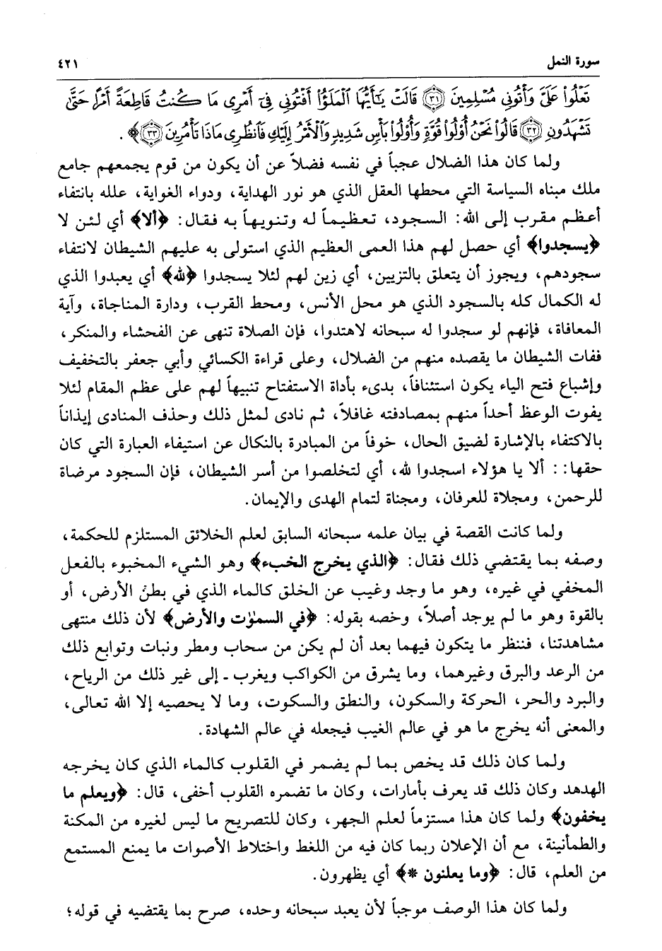 ولما كان هذا الضلال عجباً في نفسه فضلاص عن أن يكون من قوم يجمعهم جامع ملك مبناه السياسة التي محطها العقل الذي هو نور الهداية ، ودواء الغواية ، علله بانتفاء أعظم مقرب إلى الله : السجود ، تعظيماً له وتنويهاً به فقال : ( ألا ( اي لئن لا ) يسجدوا ) أي حصل لهم هذا العمى العظيم الذي استولى به عليهم الشيطان لانتفاء سجودهم ، ويجوز أن يتعلق بالتزيين ، اي زين لهم لئلا يسجدوا ) لله ) أي يعبدوا الذي له الكمال كله بالسجود الذي هو محل الإنس ، ومحط القرب ، ودارة المناجاة ، وآية المعافاة ، فإنهم لو سجدوا له سبحانه لاهتدوا ، فإن الصلاة تنهى عن الفحشاء والمنكر ، ففات الشيطان ما يقصده منهم من الضلال ، وعلى قراءة الكسائي وأبي جعفر بالتخفيف وإشباع فتح الياء يكون استئنافاً ، بدىء بأداة الاستفتاح تنبيهاً لهم على عظم المقام لئلا يفوت الوعظ أحداً منهم بمصادفته غافلاً ، ثم نادى لمثل ذلك وحذف المنادى إيذاناً بالاكتفاء بالإشارة لضيق الحال ، خوفاً من المبادرة بالنكال عن استيفاء العبارة التي كان حقها : : ألا يا هؤلاء اسجدوا لله ، أي لتخلصوا من أسر الشيطان ، فإن السجود مرضاة للرحمن ، ومجلاة للعرفان ، ومجناة لتمام الهدى والإيمان .