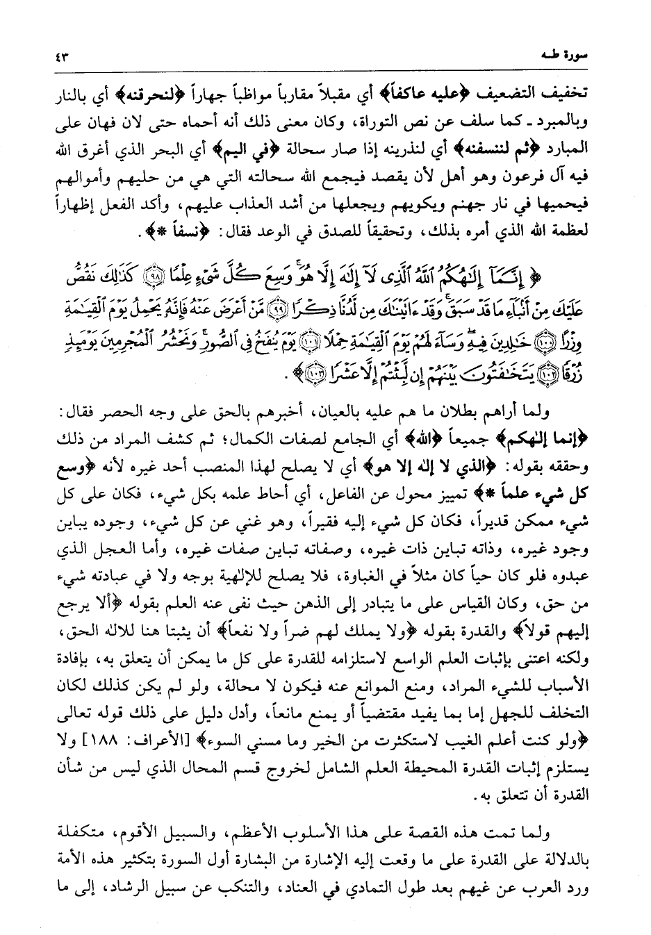 ) إِنَّمَآ إِلَهُكُمُ اللَّهُ الَّذِي لا إِلَهَ إِلاَّ هُوَ وَسِعَ كُلَّ شَيْءٍ عِلْماً كَذلِكَ نَقُصُّ عَلَيْكَ مِنْ أَنْبَآءِ مَا قَدْ سَبَقَ وَقَدْ آتَيْنَاكَ مِن لَّدُنَّا ذِكْراً مَّنْ أَعْرَضَ عَنْهُ فَإِنَّهُ يَحْمِلُ يَوْمَ الْقِيَامَةِ وِزْراً خَالِدِينَ فِيهِ وَسَآءَ لَهُمْ يَوْمَ الْقِيَامَةِ حِمْلاً يَوْمَ يُنفَخُ فِي الصُّورِ وَنَحْشُرُ الْمُجْرِمِينَ يَوْمِئِذٍ زُرْقاً يَتَخَافَتُونَ بَيْنَهُمْ إِن لَّبِثْتُمْ إِلاَّ عَشْراً ( ( )