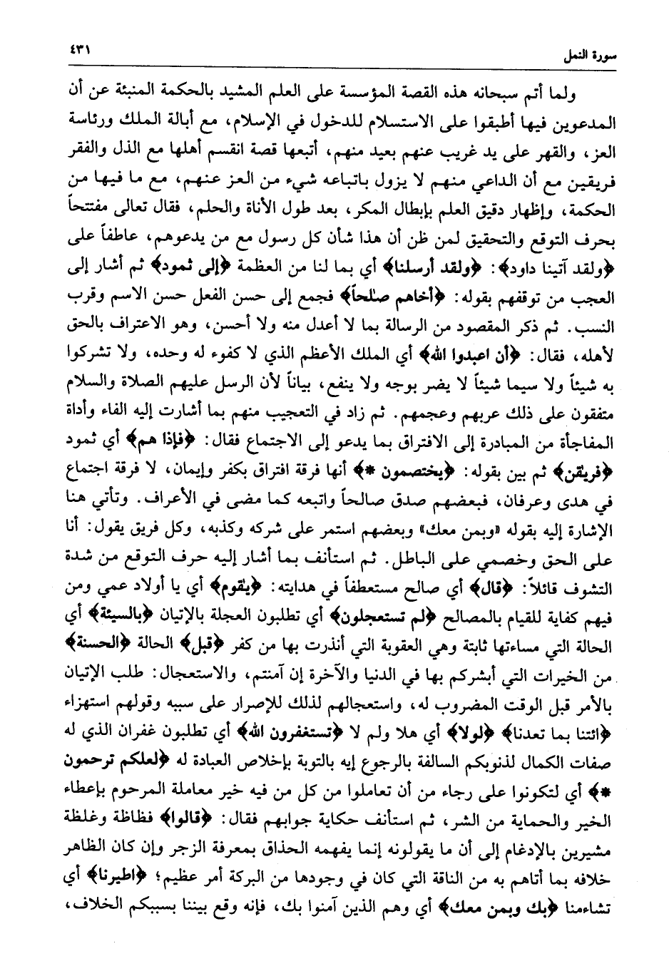 ولماأتم سبحانه هذه القصة المؤسسة على العلم المشيد بالحكمة المنبئة عن أن المدعوين فيها أطبقوا على الاستسلام للدخول في الإسلام ، مع أبالة الملك ورئاسة العز ، والقهر على يد غريب عنهم بعيد منهم ، أتبعها قصة انقسم أهلها مع الذل والفقر فريقين مع أن الداعي منهم لا يزول باتباعه شيء من العز عنهم ، مع ما فيها من الحكمة ، وإظهار دقيق العلم بإبطال المكر ، بعد طول الأناة والحلم ، فقال تعالى مفتتحاً بحرف التوقع والتحقيق لمن ظن أن هذا شأن كل رسول مع يدعوهم ، عاطفاً على ) ولقد آتينا داود ( : ( ولقد أرسنا ) أي بما لنا من العظمة ) إلى ثمود ( ثم أشار إلى العجب من توقفهم بقوله : ( أخاهم صالحاً ( فجمع إلى حسن الاسم وقرب النسب .