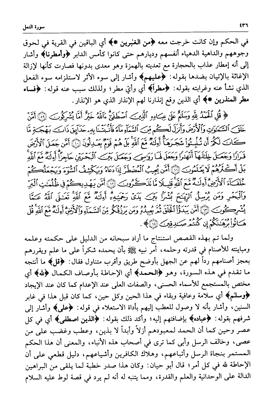 ) قُلِ الْحَمْدُ لِلَّهِ وَسَلاَمٌ عَلَى عِبَادِهِ الَّذِينَ اصْطَفَى ءَآللَّهُ خَيْرٌ أَمَّا يُشْرِكُونَ أَمَّنْ خَلَقَ السَّمَاوَاتِ وَالأَرْضَ وَأَنزَلَ لَكُمْ مِّنَ السَّمَآءِ مَآءً فَأَنبَتْنَا بِهِ حَدَآئِقَ ذَاتَ بَهْجَةٍ مَّا كَانَ لَكُمْ أَن تُنبِتُواْ شَجَرَهَا أَءِلَهٌ مَّعَ اللَّهِ بَلْ هُمْ قَوْمٌ يَعْدِلُونَ أَمَّن جَعَلَ الأَرْضَ قَرَاراً وَجَعَلَ خِلاَلَهَآ أَنْهَاراً وَجَعَلَ لَهَا رَوَاسِيَ وَجَعَلَ بَيْنَ الْبَحْرَيْنِ حَاجِزاً أَءِلَهٌ مَّعَ اللهِ بَلْ أَكْثَرُهُمْ لاَ يَعْلَمُونَ أَمَّن يُجِيبُ الْمُضْطَرَّ إِذَا دَعَاهُ وَيَكْشِفُ السُّوءَ وَيَجْعَلُكُمْ حُلَفَآءَ الأَرْضِ أَءِلَهٌ مَّعَ اللَّهِ قَلِيلاً مَّا تَذَكَّرُونَ أَمَّن يَهْدِيكُمْ فِي ظُلُمَاتِ الْبَرِّ وَالْبَحْرِ وَمَن يُرْسِلُ الرِّيَاحَ بُشْرًى بَيْنَ يَدَيْ رَحْمَتِهِ أَءِلَهٌ مَّعَ اللَّهِ تَعَالَى اللَّهُ عَمَّا يُشْرِكُونَ أَمَّن يَبْدَأُ الْخَلْقَ ثُمَّ يُعيدُهُ وَمَن يَرْزُقُكُم مِّنَ السَّمَآءِ والأَرْضِ أَءِلَهٌ مَّعَ اللَّهِ قُلْ هَاتُواْ بُرْهَانَكُمْ إِن كُنتُمْ صَادِقِينَ ( ( )