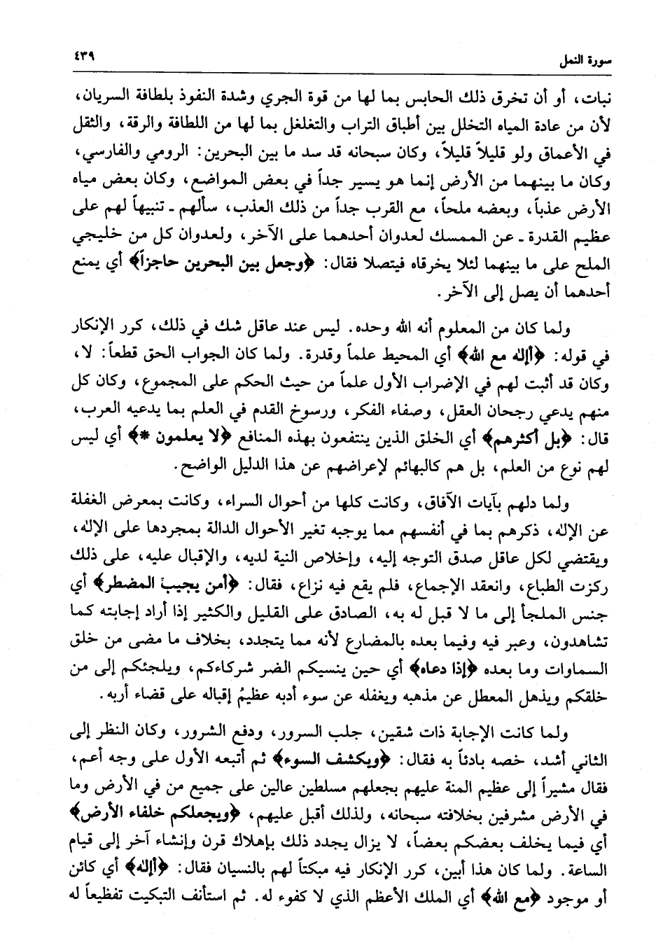 نبات ، أو أن تخرق ذلك الحابس بما لها من قوة الجري وشدة النفوذ بلطافة السريان ، لأن من عادة المياه التخلل بين أطباق التراب والتغلغل بما لها من اللطافة والرقة ، والثقل في الأعماق ولو قليلاً قليلاً ، وكان سبحانه قد سد ما بين البحرين : الرومي والفارسي ، وكان ما بينهما من الأرض إنما هو يسير جداً في بعض المواضع ، وكان بعض مياه الأرض عذباً ، وبعضه ملحاً ، معالقرب جداً من ذلك العذب ، سالهم - تنبيهاً لهم على عظيم القدرة - عن الممسك لعدوان أحدهما على آخر ، ولعدوان كل من خليجي الملح على ما بينهما لئلا يخرقاه فيتصلا فقال : ( وجعل بين البحرين حاجزاً ( اي يمنع أحدهما أن يصل إلى الآخر .