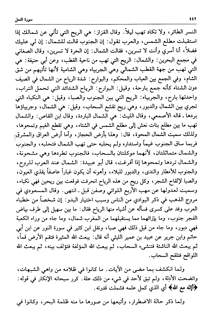 وقال المسعودي في مروج الذهب في ذكر البوادي من الناس وسبب اختيار البدو : إن شخصاً من خطباء العرب وفد على كسرى فسأله عن أشياء منها الرياح فقال : ما بين سهيل إلى طرف بياض الفجر جنوب ، وما بإزائهما مما يستقبلهما من المغرب شمال ، وما جاء من وراء الكعبة فهي دبور ، وما جاء من قبل ذلك فهي صبا ، ونقل ابن كثير في سورة النور عن ابن أبي حام وابن جرير عن عبيد بن عمير الليثي أنه قال : يبعث الله المثيرة فتقم الأرض قماً ، ثم يبعث الله الناشئة فتنشىء السحاب ، ثم يبعث الله المؤلفة فتؤلف بينه ، ثم يبعث الله اللواقح فتلقح السحاب .