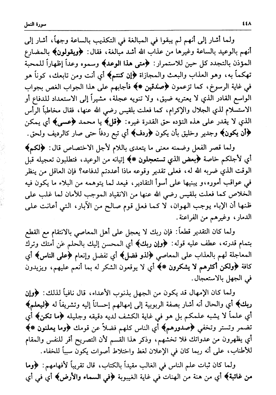 ولما أشار إلى أنهم لم يبقوا في المبالغة في التكذيب بالساعة وجهاً ، أشار إلى أنهم بالوعيد بالساعة وغيرها من عذاب الله أشد مبالغة ، فقالك ) ويقولون ( بالمضارع المؤذن بالتجدد كل حين للاستمرار : ( متى هذا الوعد ( وسمه وعداً إظهاراً للمحبة تهكماً به ، وهو العذاب والبعث والمجازاة ) إن كنتم ) أي أنت ومن تابعك ، كوناً هو في غاية الرسوخ ، كما تزعمون ) صادقين ( فأجابهم على هذا الجواب الغ بجواب الواسع القادر الذي لا يعتريه ضيق ، ولا تنويه عجلة ، مشيراً إلى الاستعداد للدفاع أو الاستسلام لذي الجلال والإكرام ، كما فعلت بلقيس رضي الله عنها ، فقال مخاطباً الرأس الذي لا يقدر على هذه التؤدة حق القدرة غيره : ( قل ( يا محمد ) عسى ) أي يمكن ) أن يكون ( وجديروخليق بأن يكون ) ردف ) أي تبع ردفاً حتى صار كالرديف ولحق .