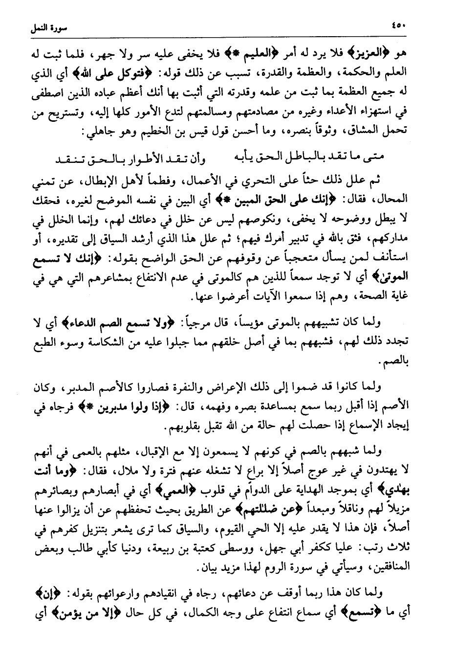 ثم علل ذلك حثاً على التحري في الأعمال ، وفطماً لأهل الإبطال ، عن تمني المحال ، فقال : ( إنك على الحق المبين ) أي البين في نفسه الموضح لغيره ، فحقك لا يبطل ووضوحه لا يخفى ، ونكوصهم ليس عن خلل في دعائك لهم ، وإنما الخلل في مداركهم ، فثق بالله في تدبير أمرك فيهم ؛ ثم علل هذا الذي أرشد السياق إلى تقديره ، أو استأنف لمن يسأل متعجباً عن وقوفهم عن الحق الواضح بقوله : ( إنك لا تسمع الموتى ) أي لا توجد سمعاً للذين هم كالموتى في عدم الانتفاع بمشاعرهم التي هي في غاية الصحة ، وهم إذا سمعوا الآيات أعرضوا عنها .