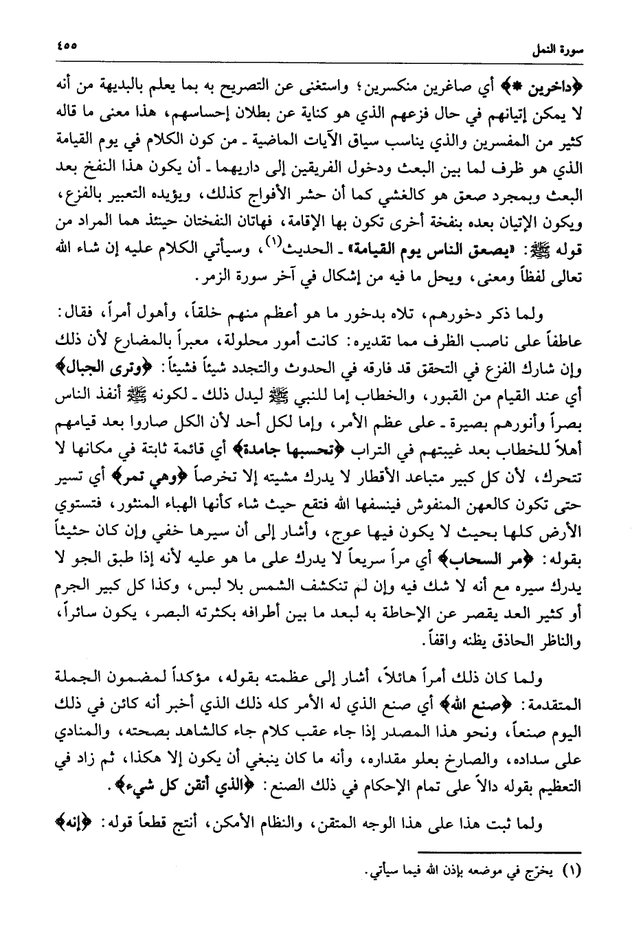 ) داخرين ) أي صاغرين منكسرين ؛ واستغنى عن التصريح به بما يعلم بالبديهة منأنه لا يمكن إتيانهم في حال فزعهم الذي هو كناية عن بطلان إحساسهم ، هذا معنى ما قاله كثير من المفسرين والذي يناسب سياق الآيات الماضية - من كون الكلام في يوم القيامة الذي هو ظرف لما بين البعث ودخول الفريقين إلى داريهما - أن يكون هذا النفخ بعد البعث وبمجرد صعق هو كالغشي كما أن حشر الأفواج كذلك ، ويؤيده التعبير بالفزع ، ويكون الإتيان بعده بنفخة أخرى تكون بها الإقامة ، فهاتان النفختان حينئذ هما المراد من قوله ( صلى الله عليه وسلم ) : ( يصعق الناس يوم القيامة ) - الحديث ، وسيأتي الكلام عليه إن شاء الله تعالى لفظاً ومعنى ، ويحل ما فيه من إشكال في آخر سورة الزمر .