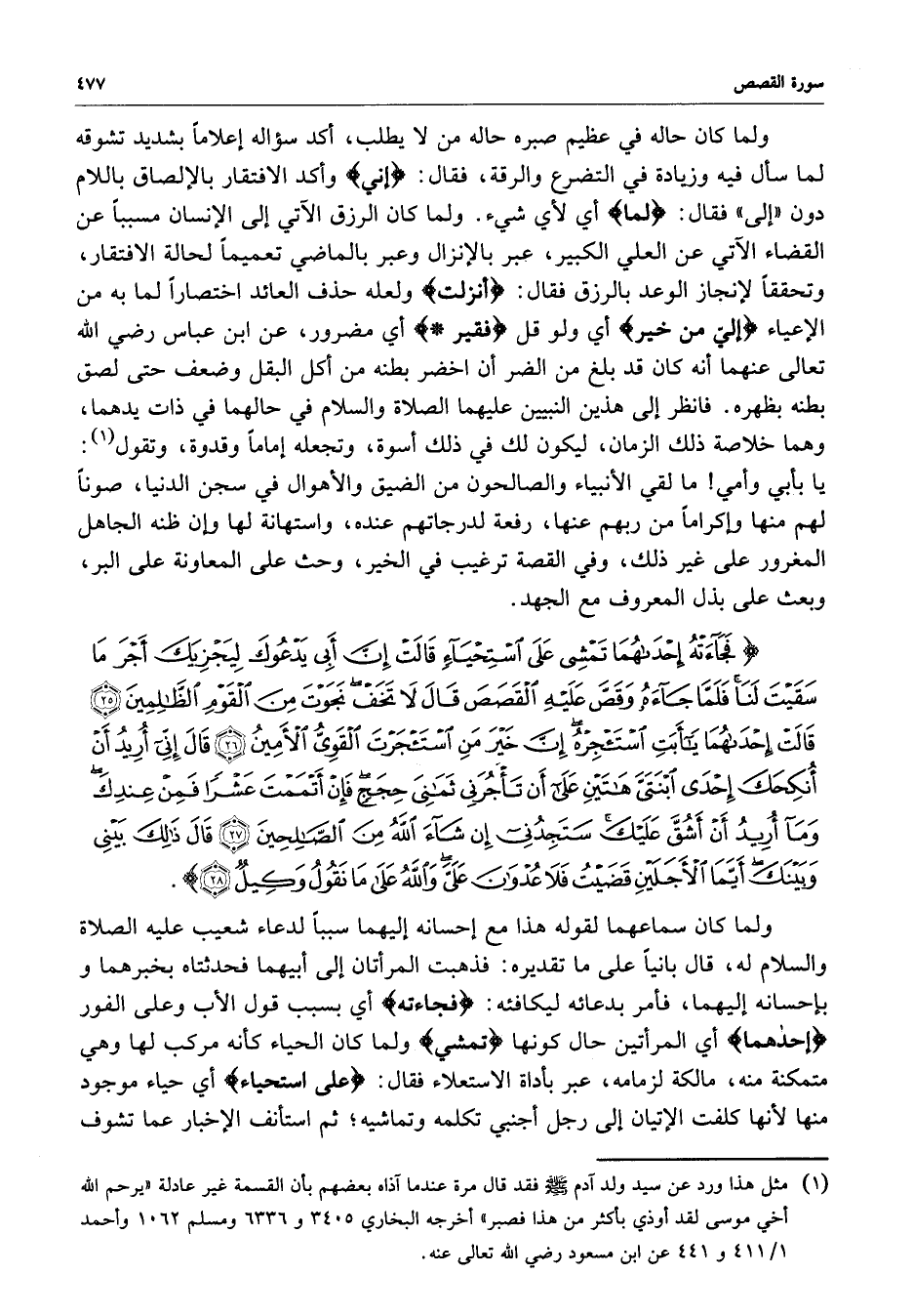 ) فَجَآءَتْهُ إِحْدَاهُمَا تَمْشِي عَلَى اسْتِحْيَآءٍ قَالَتْ إِنَّ أَبِي يَدْعُوكَ لِيَجْزِيَكَ أَجْرَ مَا سَقَيْتَ لَنَا فَلَمَّا جَآءَهُ وَقَصَّ عَلَيْهِ الْقَصَصَ قَالَ لاَ تَخَفْ نَجَوْتَ مِنَ الْقَوْمِ الظَّالِمِينَ قَالَتْ إِحْدَاهُمَا يأَبَتِ اسْتَأْجِرْهُ إِنَّ خَيْرَ مَنِ اسْتَأْجَرْتَ الْقَوِيُّ الأَمِينُ قَالَ إِنِّي أُرِيدُ أَنْ أُنكِحَكَ إِحْدَى ابْنَتَيَّ هَاتَيْنِ عَلَى أَن تَأْجُرَنِي ثَمَانِيَ حِجَجٍ فَإِنْ أَتْمَمْتَ عَشْراً فَمِنْ عِندِكَ وَمَآ أُرِيدُ أَنْ أَشُقَّ عَلَيْكَ سَتَجِدُنِي إِن شَاءَ اللَّهُ مِنَ الصَّالِحِينَ قَالَ ذَلِكَ بَيْنِي وَبَيْنَكَ أَيَّمَا الأَجَلَيْنِ قَضَيْتُ فَلاَ عُدْوَانَ عَلَيَّ وَاللَّهُ عَلَى مَا نَقُولُ وَكِيلٌ ( ( )