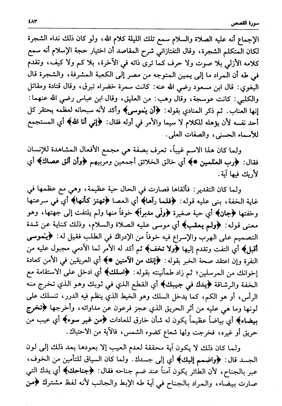 الإجماع أنه عليه الصلاة والسلام سمع تلك الليلة كلام الله ، ولو كان ذلك نداء الشجرة لكان المتكلم الشجرة ، وقال التفتازاني شرح المقاصد أن اختيار حجة الإسلام أنه سمع كلامه الأزلي بلا صوت ولا حرف كما ترى ذاته في الآخرة ، بلا كم ولا كيف ، وتقدم في طه أن المراد ما إلى يمين المتوجه من مصر إلى الكعبة المشرفة ، والشجرة قال الغوي : قال ابن مسعود رضي الله عنه : كانت سمرة خضراء تبرق ، وقال قتادة ومقاتل والكلبي : كانت عوسجة ، وقال وهب : من العليق ، وقال ابن عباس رضي الله عنهما : إنها العناب .
