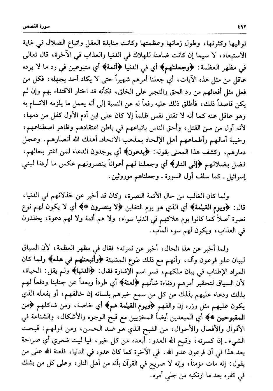 ولما أخبر عن هذا الحال ، أخبر عن ثمرته ؛ فقال في مظهر العظمة ، لأن السياق لبيان علو فرعون وآله ، وأ ، هم مع ذلك طوع المشيئة ) وأتبعناهم في هذه ( ولما كان المراد الإطناب في بيان ملكهم ، فسر اسم الإشارة فقال : ( الدنيا ( ولم يقل : الحياة ، لأن السياق لتحقير أمرهم ودناءة شأنهم ) لعنة ) أي طرداً وبعداً عن جنابنا ودفعاً لهم بذلك عليهم مثل وزرة إن والفهم ) ويوم القيامة هم ( اي خاصة ، ومن شاكلهم ) من المقبوحين ) أي المبعدين أيضاً المخزيين مع قبح الوجوه والأشكال ، والشناعة في الأقوال وزالأفعال والأحوال ، من القبح الذي هو ضد الحسن ، ومن قولهم : قبحت الشيء - إذا كسرته ، وقبح الله العدو : أبعده عن كل خير ، فيا ليت شعري أي صراحة بعد هذا في أن فرعون عدو الله ، في الآخرة كما كان عدوه في الدنيا ، فلعنة الله على من يقول : إنه مات مؤمناً ، وإنه لا صريح في القرآن بأنه من أهل النار ، وعلى كل من يشك في كفره بعد كا ارتكبه من جلي أمره .