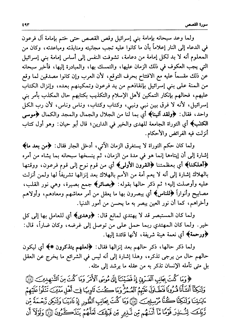 ) وَمَا كُنتَ بِجَانِبِ الْغَرْبِيِّ إِذْ قَضَيْنَآ إِلَى مُوسَى الأَمْرَ وَمَا كنتَ مِنَ الشَّاهِدِينَ وَلَكِنَّآ أَنشَأْنَا قُرُوناً فَتَطَاوَلَ عَلَيْهِمُ الْعُمُرُ وَمَا كُنتَ ثَاوِياً فِي أَهْلِ مَدْيَنَ تَتْلُو عَلَيْهِمْ آيَاتِنَا وَلَكِنَّا كُنَّا مُرْسِلِينَ وَمَا كُنْتَ بِجَانِبِ الطُّورِ إِذْ نَادَيْنَا وَلَكِن رَّحْمَةً مِّن رَّبِّكَ لِتُنذِرَ قَوْماً مَّآ أَتَاهُم مِّن نَّذِيرٍ مِّن قَبْلِكَ لَعَلَّهُمْ يَتَذَكَّرُونَ وَلَوْلا أَن