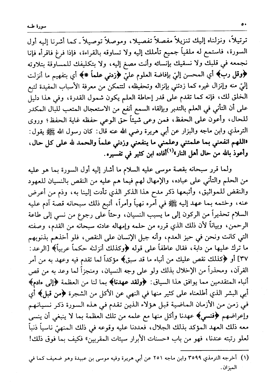 ترتيلاً ، زنزلناه إليك تنزيلاً مفصلاً تفصيلاً ، وموصلاً توصيلاً - كما أشرنا غليه أول السورة ، فاستمع له ملقياً جميع تأمك إليه ولا تساوقه بالقراءة ، فإذا فرغ فاقرأه فإنا نجمعه في قلبك ولا نسقيك بإنسائه وأنت مصغ إليه ، ولأ بتكليفك للمساوقة بتلاوته ) وقل ربي ( اي المحسن إليّ بإفاضة العلو عليّ ) زدني علماً ) أي بتفهيم ما أنزلت إليّ منه وإنزال غيره كما زدتني بإنزاله وتحفيظه ، لتتمكن من معرفة الأسباب المفيدة لتبع الخلق لك ، فإنه كما تقدم على قدر إحاطة العلم يكون شمول القدرة ، وفي هذا دليل على أن التاني في العلم بالتدبر وبإلقاء السمع أنفع من الاستعجال المتعب للبال المكدر للحال ، وأعون على الحفظ ، فمن وعى شيئاً حق الوعي حفظه غاية الحفظ ؛ وروى الترميذي وابن ماجة والبزار عن أبي هريرة رضي الله عنه قال كان رسول الله ( صلى الله عليه وسلم ) يقول : ( للهم انفعني بما علمتني وعلمني ما ينفعني وزدني علماً والحمد لله على كل حال ، وأعوذ بالله من حال أهل النار ) أفاده ابن كثير في تفسيره .