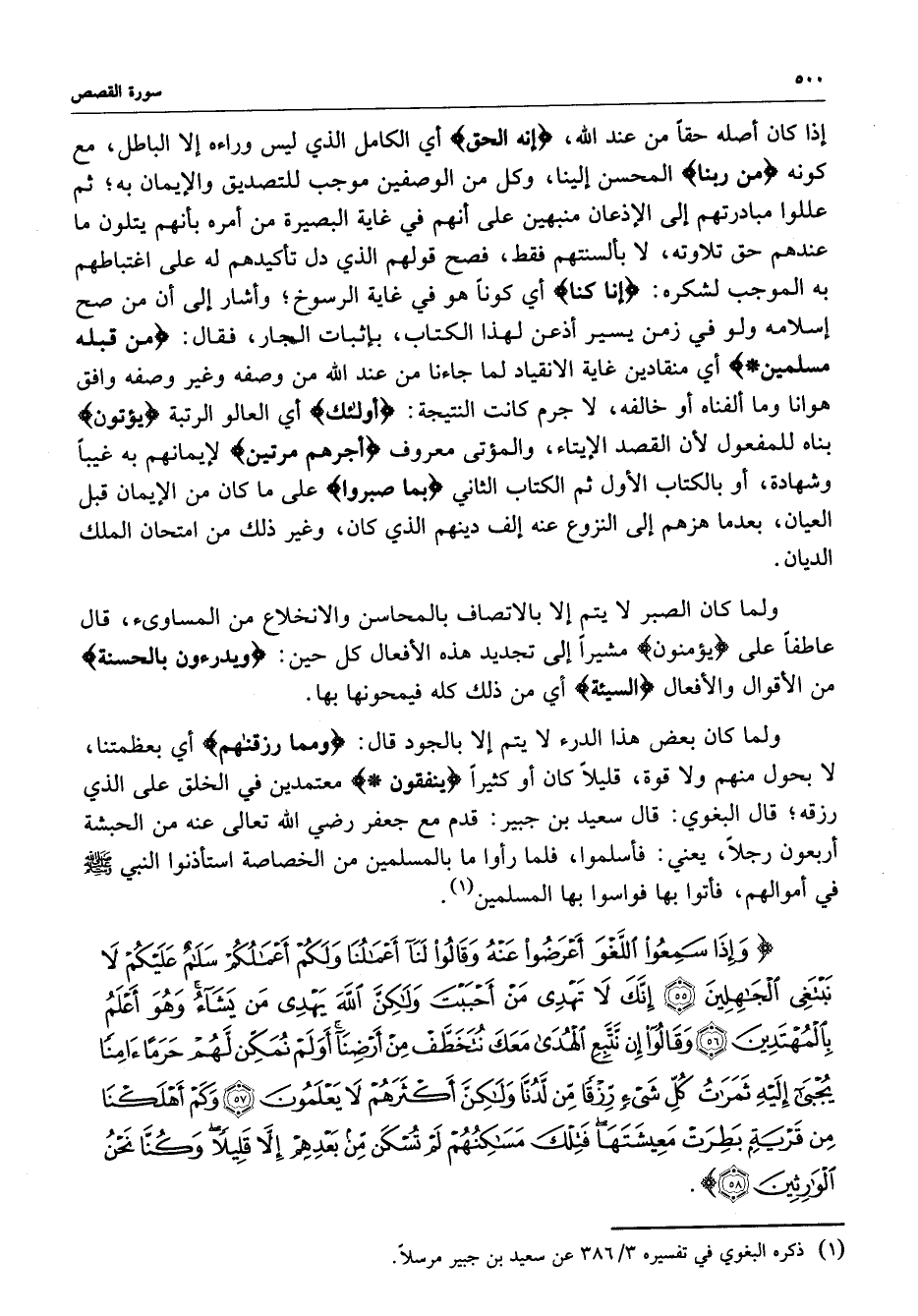 ) وَإِذَا سَمِعُواْ اللَّغْوَ أَعْرَضُواْ عَنْهُ وَقَالُواْ لَنَآ أَعْمَالُنَا وَلَكُمْ أَعْمَالُكُمْ سَلاَمٌ عَلَيْكُمْ لاَ نَبْتَغِي الْجَاهِلِينَ إِنَّكَ لاَ تَهْدِي مَنْ أَحْبَبْتَ وَلَكِنَّ اللَّهَ يَهْدِي مَن يَشَآءُ وَهُوَ أَعْلَمُ بِالْمُهْتَدِينَ وَقَالُواْ إِن نَّتَّبِعِ الْهُدَى مَعَكَ نُتَخَطَّفْ مِنْ أَرْضِنَآ أَوَلَمْ نُمَكِّن لَّهُمْ حَرَماً آمِناً يُجْبَى إِلَيْهِ ثَمَرَاتُ كُلِّ شَيْءٍ رِّزْقاً مِّن لَّدُنَّا وَلَكِنَّ أَكْثَرَهُمْ لاَ يَعْلَمُونَ وَكَمْ أَهْلَكْنَا مِن قَرْيَةٍ بَطِرَتْ مَعِيشَتَهَا فَتِلْكَ مَسَاكِنُهُمْ لَمْ تُسْكَن مِّن بَعْدِهِمْ إِلاَّ قَلِيلاً وَكُنَّا نَحْنُ الْوَارِثِينَ ( ( )
