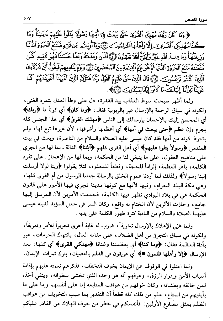 ) وَمَا كَانَ رَبُّكَ مُهْلِكَ الْقُرَى حَتَّى يَبْعَثَ فِي أُمِّهَا رَسُولاً يَتْلُو عَلَيْهِمْ آيَاتِنَا وَمَا كُنَّا مُهْلِكِي الْقُرَى إِلاَّ وَأَهْلُهَا ظَالِمُونَ وَمَآ أُوتِيتُم مِّن شَيْءٍ فَمَتَاعُ الْحَيَاةِ الدُّنْيَا وَزِينَتُهَا وَمَا عِندَ اللَّهِ خَيْرٌ وَأَبْقَى أَفَلاَ تَعْقِلُونَ أَفَمَن وَعَدْنَاهُ وَعْداً حَسَناً فَهُوَ لاَقِيهِ كَمَن مَّتَّعْنَاهُ مَتَاعَ الْحَيَاةِ الدُّنْيَا ثُمَّ هُوَ يَوْمَ الْقِيَامَةِ مِنَ الْمُحْضَرِينَ وَيَوْمَ يُنَادِيهِمْ فَيَقُولُ أَيْنَ شُرَكَآئِيَ الَّذِينَ كُنتُمْ تَزْعُمُونَ قَالَ الَّذِينَ حَقَّ عَلَيْهِمُ الْقَوْلُ رَبَّنَا هَؤُلاءِ الَّذِينَ أَغْوَيْنَآ أَغْوَيْنَاهُمْ كَمَا غَوَيْنَا تَبَرَّأْنَآ إِلَيْكَ مَا كَانُواْ إِيَّانَا يَعْبُدُونَ ( ( )