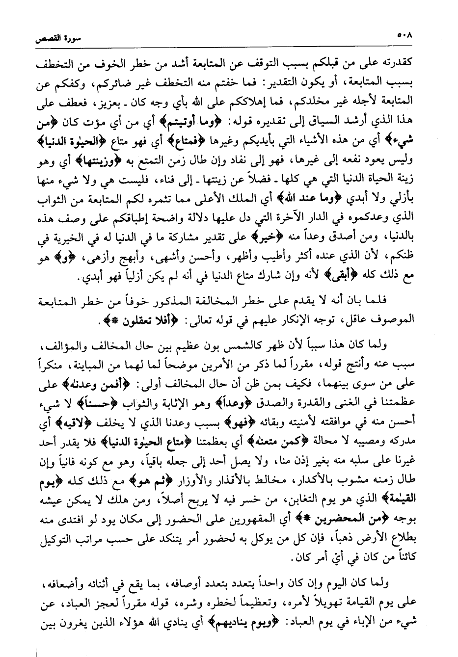 كقدرته على من قبلكم بسبب التوقف عن المتابعة أشد من خطر الخوف من التخطف بسبب ا لمتابعة ، أو يكون التقدير : فما خفتم منه التخطف غير ضائركم ، وكفكم عن المتابعة لأجله غير مخلدكم ، إهلاككم على اله بأي وجه كان بعزيز ، عطف على هذا الذي ارشد السياق إلى تقديره قوله : ( وما أوتيتم ) أي من أي مؤت كان ) من شيء ) أي من هذه الأشياء التي بأيدكم وغيرها ) فمتاع ) أي فهو متاع ) الحياة الدنيا ( وليس يعود نفعه إلى غيرها ، فهو إلى نفاد وإن طال زمن التمتع به ) وزينتها ) أي وهو زينة الحياة الدنيا التي هي كلها فضلاً عن زينتها إلى فناء ، فليست هي ولا شيء منها بأزلي ولا أبدي ) وما عند الله ) أي الملك الأعلى مما تثمره لكم المتابعة من الثواب الذي وعدكموه في الدار الآخرة التي دل عليها دلالة واضحة إطباكم على وصف هذه بالدنيا ، ومن أصدق وعداً منه ) خير ( على تقدير مشاركة ما في الدنيا له في الخيرية في ظنكم ، لأن الذي عنده أكثر وأطيب وأظهر ، وأحسن وأشهى ، وأبهج وأزهى ، ) و ( هو مع ذلك كله ) أبقى ( لأنه وإن شارك متاع الدنيا في أنه بم يكن أزلياً فهو أبدي .