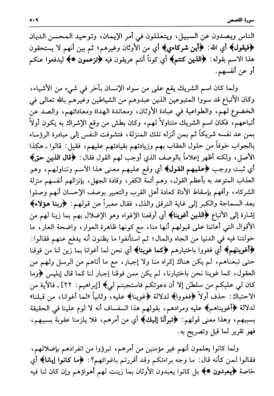 ولما كان اسم الشريك يقع على من سواه الإنسان آخر في شيء من الأشياء ، وكان الأتباع قد سووا المتبوعين الذين عبدوهم من الشيتطين وغيرهم بالله تعالى في الخضوع لهم ، والطواعية في عبادة الأوثان ، ومعاندة الهداة ومعاداتهم ، والصد عن أتباعهم ، فكلان اسم الشريك متناولاً لهم ، وكان بطش من وزقع الإشراك به يكون أولاً بمن عد نفسه شريكاً ثم بمت أنزله تلك المنزلة ، فتشوفت النفس إلى مبادرة الرؤساء بالجواب خوفاً من حلول العقاب بهم وزيادتهم بقادتهم عليهم ، فقيل : قالوا هكذا الأصل ، ولكنه أظهر إعلاماً بالوصف الذي أوجب لهم القول فقال : ( قال الذين حق ) أي ثبت ووجب ) عليهم القول ) أي وقع عليهم معنى هذا الاسم وتناولهم ، وهو العذاب المتوعد به بأعظم القول ، وهم أئمة الكفر ، وقادة الجهل ، بإنزالهم أنفسهم منزلة الشركاء ، وأفهم بإسقاط الأداة كعادة أهل القرب والتعبير بوصف الإحسان أ ، هم وصلوا بعد السماجة والكبر إلى غاية الترق والذل ، فقال معبراً عن قولهم : ( ربنا هؤلاء ( إشارة إلى الأتباع ) الذين أغوينا ) أي أوقعنا الإغواء وهو الإضلال بهم بما زينا لهم من الأقوال التي أعاننا على قبولهم أ ، ها منا ، مع كونا ظاهرة العوار ، واضحة العر ، ما خولتنا فيه في الدنيا من الجاه والمال ؛ ثم استأنفوا مات يظنون أنه يدفع عنهم فقالوا : ( أغويناهم ) أي فغوا باختيارهم ) كما غوينا ) أي نحن لما أغوانا بما زين لنا من فوقنا حتى تبعناهم ، لم يكن هناك إكراه منا ولا إجبار ، مع ما أاهم من الرسل ولهم من العقول ، كما غوينا نحن باخيارنا ، لم يكن ممن فوقنا إجبار لنا كما قال إبليس