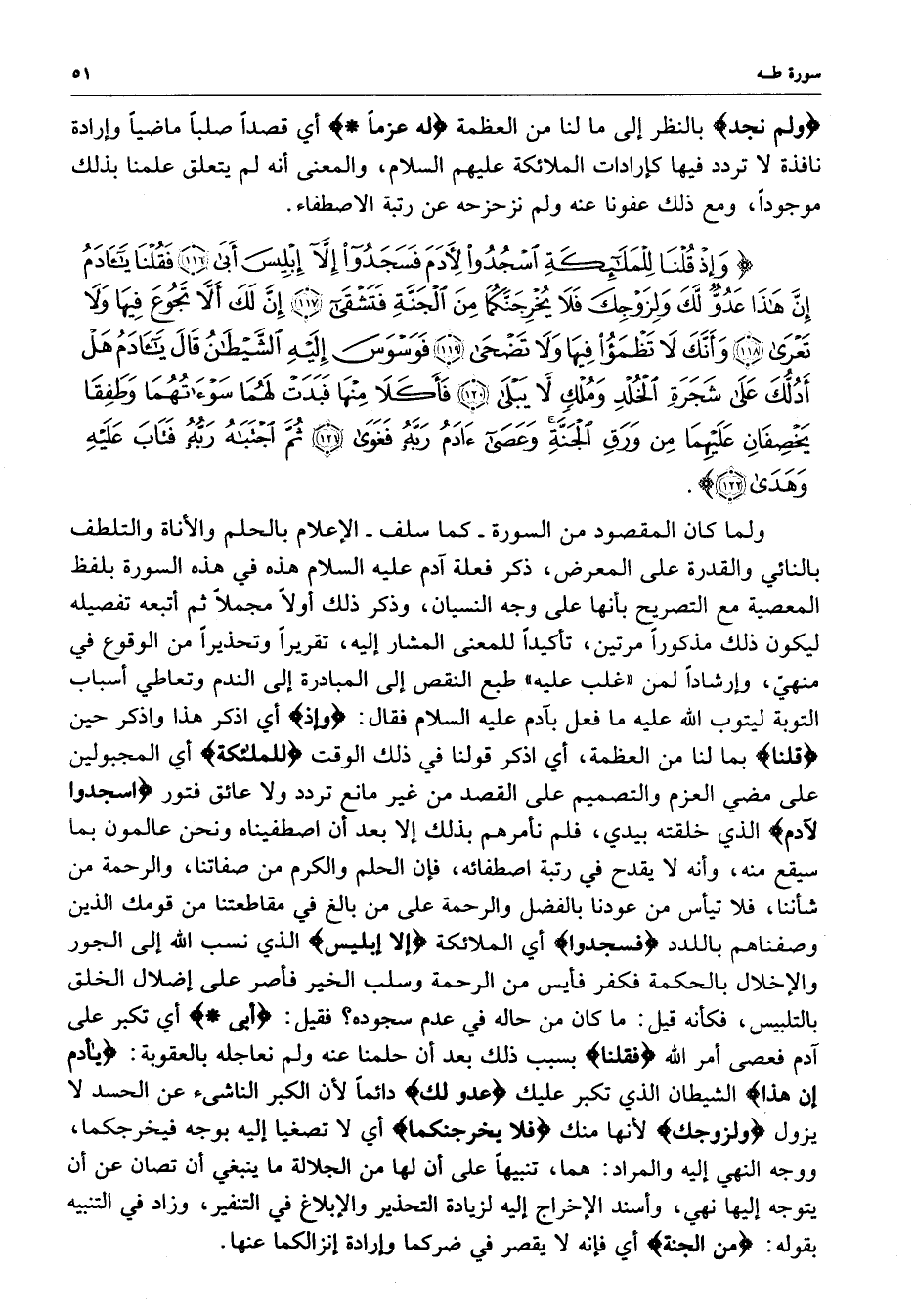 ) وَإِذْ قُلْنَا لِلْمَلاَئِكَةِ اسْجُدُواْ لآدَمَ فَسَجَدُواْ إِلاَّ إِبْلِيسَ أَبَى فَقُلْنَا يآدَمُ إِنَّ هَذَا عَدُوٌّ لَّكَ وَلِزَوْجِكَ فَلاَ يُخْرِجَنَّكُمَا مِنَ الْجَنَّةِ فَتَشْقَى إِنَّ لَكَ أَلاَّ تَجُوعَ فِيهَا وَلاَ تَعْرَى وَأَنَّكَ لاَ تَظْمَأُ فِيهَا وَلاَ تَضْحَى فَوَسْوَسَ إِلَيْهِ الشَّيْطَانُ قَالَ يآدَمُ هَلْ أَدُلُّكَ عَلَى شَجَرَةِ الْخُلْدِ وَمُلْكٍ لاَّ يَبْلَى فَأَكَلاَ مِنْهَا فَبَدَتْ لَهُمَا سَوْءَاتُهُمَا وَطَفِقَا يَخْصِفَانِ عَلَيْهِمَا مِن وَرَقِ الْجَنَّةِ وَعَصَى ءَادَمُ رَبَّهُ فَغَوَى ثُمَّ اجْتَبَاهُ رَبُّهُ فَتَابَ عَلَيْهِ وَهَدَى ( ( )