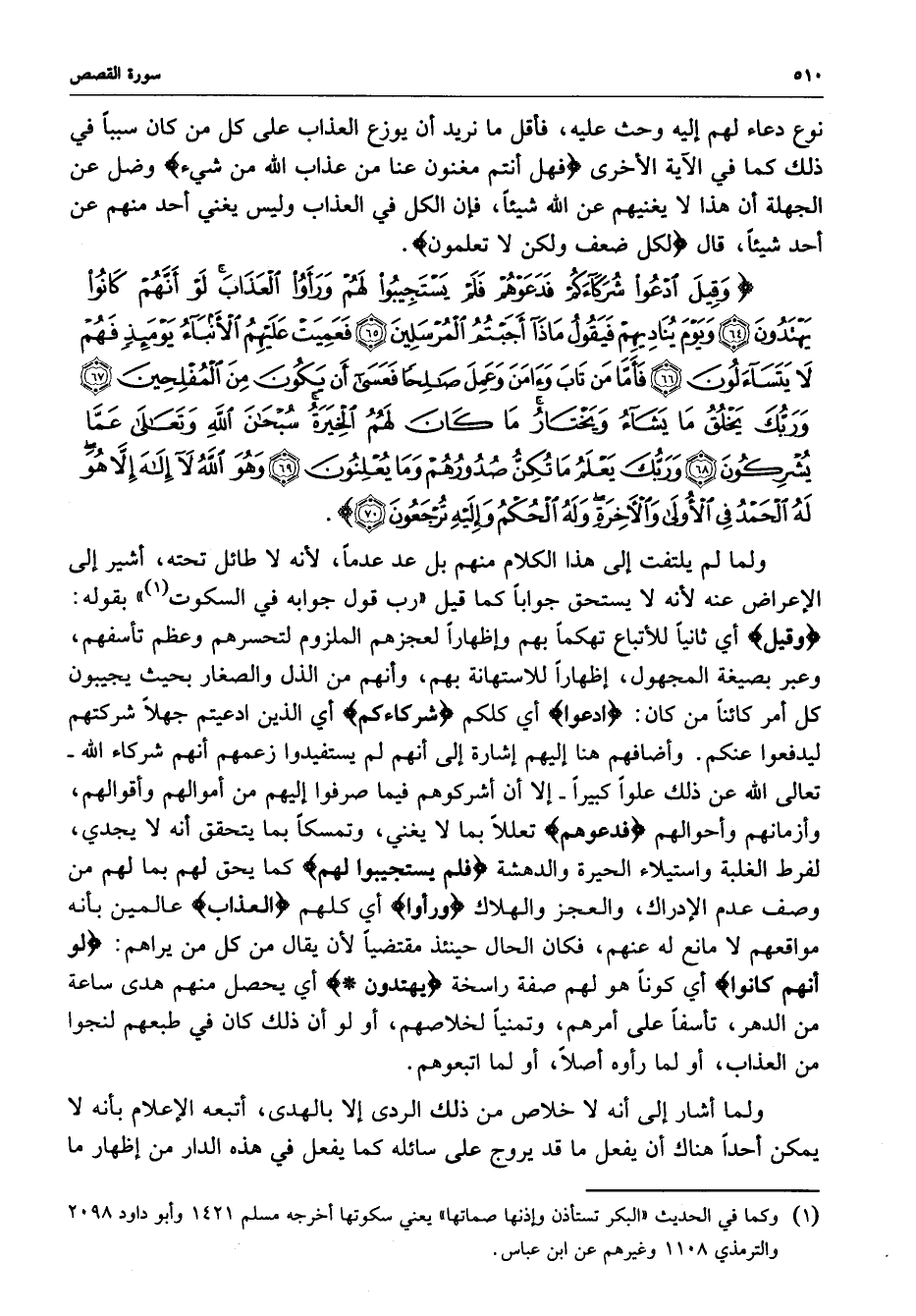 ) وَقِيلَ ادْعُواْ شُرَكَآءَكُمْ فَدَعَوْهُمْ فَلَمْ يَسْتَجِيبُواْ لَهُمْ وَرَأَوُاْ الْعَذَابَ لَوْ أَنَّهُمْ كَانُواْ يَهْتَدُونَ وَيَوْمَ يُنَادِيهِمْ فَيَقُولُ مَاذَآ أَجَبْتُمُ الْمُرْسَلِينَ فَعَمِيَتْ عَلَيْهِمُ الأَنبَآءُ يَوْمَئِذٍ فَهُمْ لاَ يَتَسَآءَلُونَ فَأَمَّا مَن تَابَ وَآمَنَ وَعَمِلَ صَالِحاً فَعَسَى أَن يَكُونَ مِنَ الْمُفْلِحِينَ وَرَبُّكَ يَخْلُقُ مَا يَشَآءُ وَيَخْتَارُ مَا كَانَ لَهُمُ الْخِيَرَةُ سُبْحَانَ اللَّهِ وَتَعَالَى عَمَّا يُشْرِكُونَ وَرَبُّكَ يَعْلَمُ مَا تُكِنُّ صُدُورُهُمْ وَمَا يُعْلِنُونَ وَهُوَ اللَّهُ لا إِلَهَ إِلاَّ هُوَ لَهُ الْحَمْدُ فِي الأُولَى وَالآخِرَةِ وَلَهُ الْحُكْمُ وَإِلَيْهِ تُرْجَعُونَ ( ( )