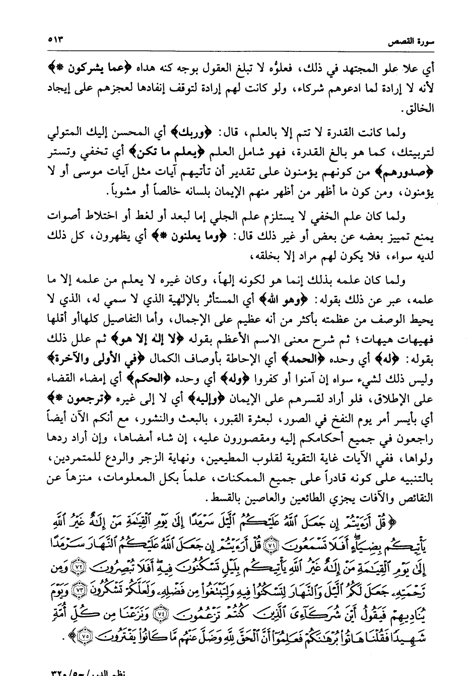 ) قُلْ أَرَأَيْتُمْ إِن جَعَلَ اللَّهُ عَلَيْكُمُ الْلَّيْلَ سَرْمَداً إِلَى يَوْمِ الْقِيَامَةِ مَنْ إِلَهٌ غَيْرُ اللَّهِ يَأْتِيكُمْ بِضِيَآءٍ أَفَلاَ تَسْمَعُونَ قُلْ أَرَأَيْتُمْ إِن جَعَلَ اللَّهُ عَلَيْكُمُ النَّهَارَ سَرْمَداً إِلَى يَوْمِ الْقِيَامَةِ مَنْ إِلَهٌ غَيْرُ اللَّهِ يَأْتِيكُمْ بِلَيْلٍ تَسْكُنُونَ فِيهِ أَفلاَ تُبْصِرُونَ وَمِن رَّحْمَتِهِ جَعَلَ لَكُمُ الْلَّيْلَ وَالنَّهَارَ لِتَسْكُنُواْ فِيهِ وَلِتَبتَغُواْ مِن فَضْلِهِ وَلَعَلَّكُمْ تَشْكُرُونَ وَيَوْمَ يُنَادِيهِمْ فَيَقُولُ أَيْنَ شُرَكَآئِيَ الَّذِينَ كُنتُمْ تَزْعُمُونَ وَنَزَعْنَا مِن كُلِّ أُمَّةٍ شَهِيداً فَقُلْنَا هَاتُواْ بُرْهَانَكُمْ فَعَلِمُواْ أَنَّ الْحَقَّ لِلَّهِ وَضَلَّ عَنْهُمْ مَّا كَانُواْ يَفْتَرُونَ ( ( )