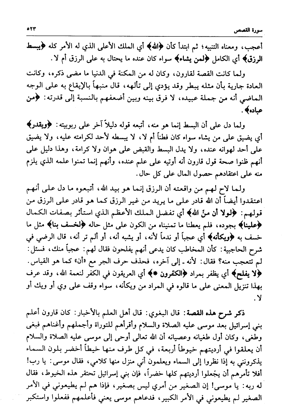 ولما لاح من واقعته أن الرزق إنما هو بيد الله ، أتبعوه ما دل على أنهم اعتقدوا أيضاً أن الله قادر على ما يريد من غير الرزق كما هو قادر على الرزق من قولهم : ( لولا أن منَّ الله ) أي تفضل الملك الأعظم الذي استأثر بصفات الكمال ) علينا ( بجوده ، فلم يعطنا ما تمنيناه من الكون على مثل حاله ) لخسف بنا ( مثل ما خسف به ) ويكأنه ) أي عجباً أو ندماً لأنه ، أو يشبه أنه ، أو ألم تر أنه ، قال الرضي في شرح الحاجبية : كأن المخاطب كان يدعى أنهم يفلحون فقال لهم : عجباً منك ، فسئل : لن تتعجب منه ؟ فقال : لأنه إلى آخره ، فحذف حرف الجر مع ( أن ) كما هو القياس .