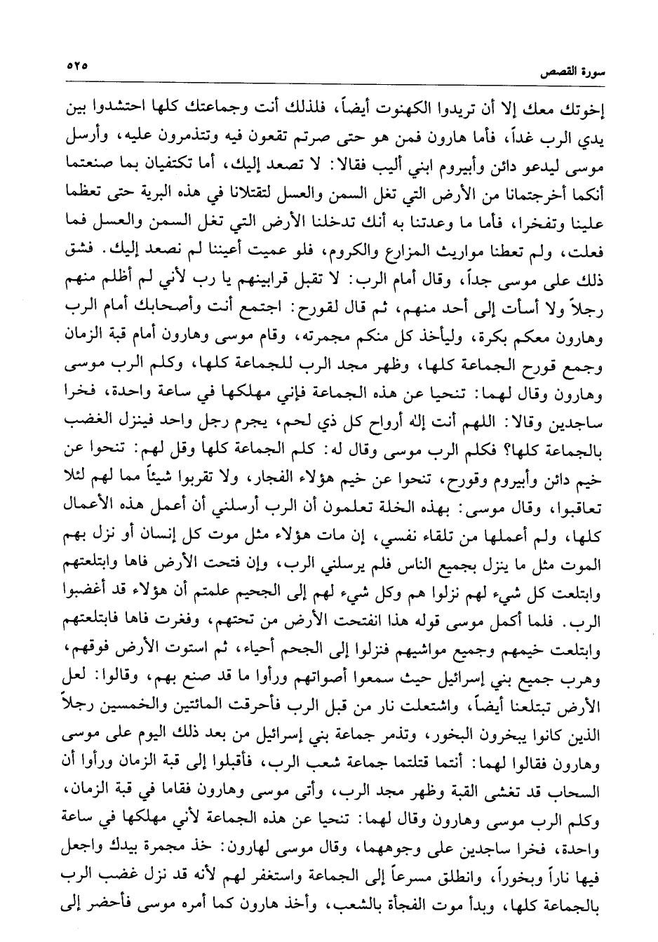 فشق ذلك على موسى جداً ، وقال أمام الرب : لا تقبل قرابينهم يا رب لأني لم أظلم منهم رجلاً ولا أسأت إلى أحد منهم ، ثم قال لقورح : اجتمع أنت وأصحابك أمام الرب وهارون معكم بكرة ، وليأخذ كل منكم مجمرته ، وقام موسى وهارون أمام قبة الزمان وجمع قورح الجماعة كلها ، وظهر مجد الرب للجماعة كلها ، وكلم الرب موسى وهارون وقال لهما : تنحيا عن هذه الجماعة فإني مهلكها في ساعة واحدة ، فخرا ساجدين وقالا : اللهم أنت إله أرواح كل ذي لحم ، يجرم رجل واحد فينزل الغضب بالجماعة كلها ؟ فكلم الرب موسى وقال له : كلم الجماعة كلها وقل لهم : تنحوا عن خيم دائن وأبيروم وقورح ، تنحوا عن خيم هؤلاء الفجار ، ولا تقربوا شيئاً مما لهم لئلا تعاقبوا ، وقال موسى : بهذه الخلة تعلمون أن الرب ارسلني أن أعمل هذه الأعمال كلها ، ولم أعملها من تلقاء نفسي ، إن مات هؤلاء مثل موت كل إنسان أو نزل بهم الموت مثل ما ينزل بجميع الناس فلم يرسلني الرب ، وإن فتحت الأرض فاها وابتلعتهم وابتلعت خيمهم وجميع مواشيهم فنزلوا إلى الجحم أحياء ، ثم استوت الأرض فوقهم ، وهرب جميع بني إسرائيل حيث سمعوا أصواتهم ورأوا ما قد صنع بهمن وقالوا : لعل الرض تبتلعنا أيضاً ، واشتعلت نار من قبل الرب فأخحرقت المائتين والخمسين رجلاً الذين كانوا يبخرون البخور ، وتذمر جماعة بني إسرائيل من بعد ذلك اليوم على موسى وهارون فقالوا لهما : أنتما قتلتما جماعة بني إسرائيل من بعد ذلك اليوم ورأوا أن السحاب قد تغشى القبة وظهر نجد الرب ، وأتى موسى وهارون فقاما في قبة الزمان ، وكلم الرب موسى وهارون وقال لهما : تنحيا عن هذه الجماعة لأني مهلكها في ساعة واحدة ، فخرا ساجدين على وجوههما ، وقال موسى لهارون : خذ مجمرة بيك واجعل فيها ناراً وبخوراً ، وانطلق مسرعاً إلى الجماعة واستغفر لهم لأنه قد نزل غضب الرب بالجماعة كلها ، وبدأ موت الفجأة بالشعب ، وأخذ هارون كما أمره موسى فأحضر إلى