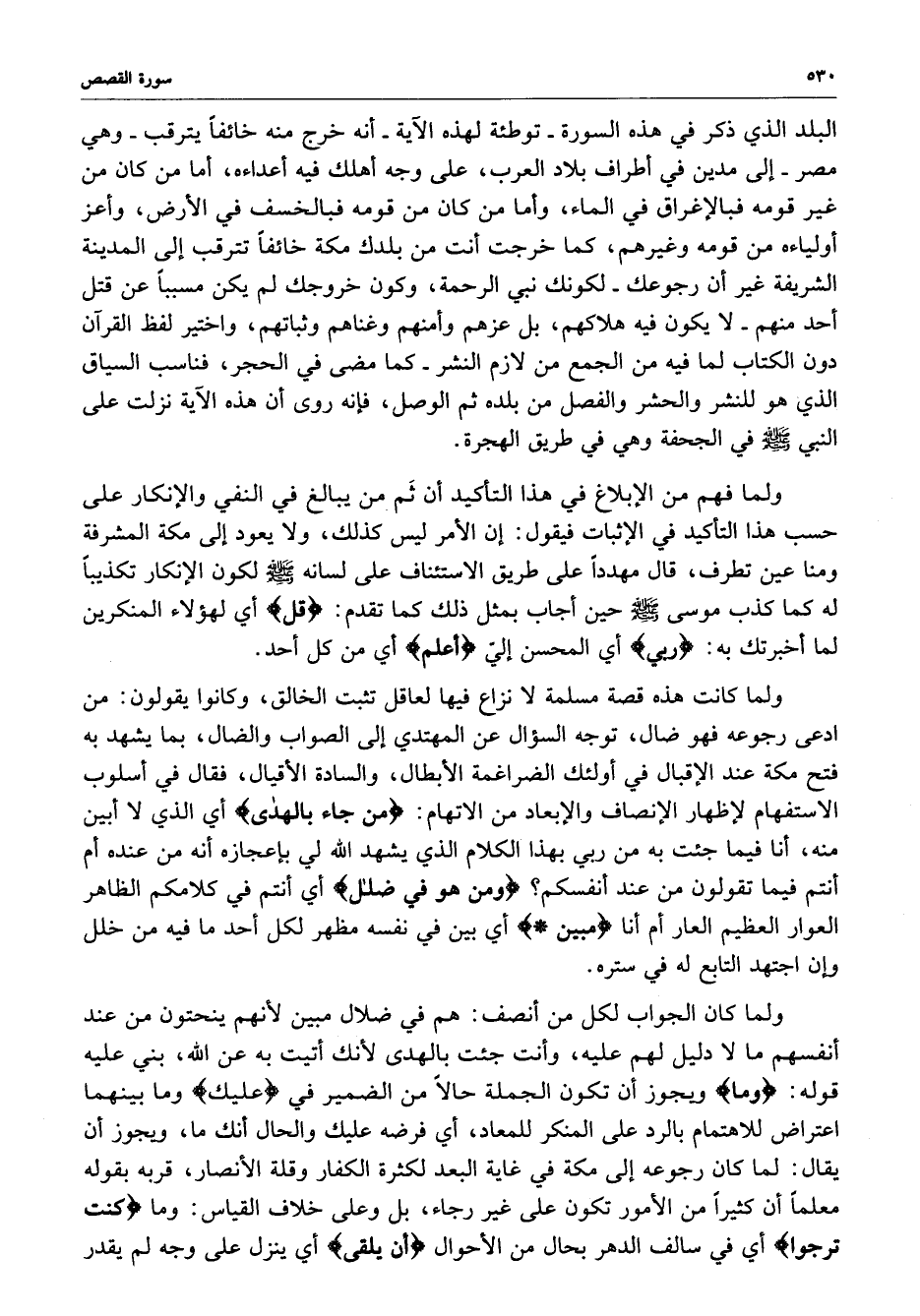 البلد الذي ذكر في هذه السورة توطئة لهذه الآية أنه خرج منه خائفاً يتوقب وهي مصر إلى مدين في أطراف بلاد العرب ، على وجه أهلك أعداءه ، أما من كان نم غير قومه وغيرهم ، كما خرجت أنت من بلدك مكة خائفاً تترقب إلى المدينة الشريفة غير أن رجوعك لكونك نبي الرحمة ، وكون خروجك لم يكن مسبباً عن قتل أحد منهم لا يكون فيه هلاكهم ، بل عزهم وأمنهم وغناهم وثباتهم ، واختير لفظ القرآن دون الكتاب لما فيه من الجمع من لازم النشر كما مضى في الحجر ، فناسب السياق الذي هو للنشر والحشر والفصل من بلده ثم الوصل ، فإنه روى أن هذه الآية نزلت على النبي ( صلى الله عليه وسلم ) في الجحفة وهي في طريق الهجرة .