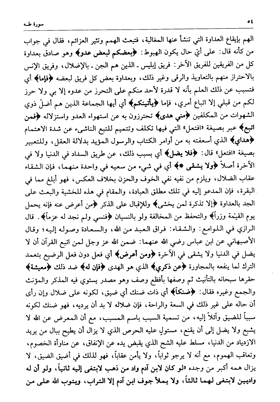الهم بإيقاع العداوة التي تنشأ عنها المغالبة ، فتبعث الهمم وتثير العزائم ، فقال في جواب من كأنه قال : على أيّ حال يكون الهبوط : ( بعضكم لبعض عدو ( وهو صادق بعداوة كل من الفريقين للفريق الآخر : فريق إبليس - الذين هم الجن - بالإضلال ، وفريق الإنس بالاحتراز منهم بالتعاويذ والرقى وغير ذلك ، وبعداوة بعض كل فريق لبعضه ) فإما ) أي فتسبب عن ذلك العلم بأنه لا قدرة لأحد منكم على التحرز من عدوه إلا بي ولا حرز لكم من قبلي إلا اتباع أمري ، فإما ) يأتينكم ) أي أيها الجماعة الذين هم أضلّ ذوي الشهوات من المكلفين ) مني هدى ( تحترزون به عن اتهوا العدو واستزلاله ) فمن اتبع ( عبر صيغة ( افتعل ) التي فيها تكلف وتتميم للتبع الناشىء عن شدة الاهتمام ) هداي ( الذي أسعفته به من أوامر الكتاي والرسول المؤيد بدلالة العقل ، وللتعبير بصيغة ( افتعل ) قال ( ) فلا يضل ) أي بسبب ذلك ، عن طريق السداد في الدنيا ولا في الآخرة أصلاً ) ولا يشقى ) أي في شيء من سعيه في واحدة منهما ، فإن الشقاء عقاب الضلال ، ويلزم من نفيه نفي الخوف والحزن بخلاف العكس ، فهو أبلغ مما في البقرة ، فإن المدعو غليه في تلك مطلق العبادة ، والمقام في هذه للخشية والبعث على الجد بالعداوة ) إلا تذكرة لمن يخشى ( وللإقبال على الذكر ) من أعرض عنه فإنه يحمل يوم القيامة وزرا ( والتحفظ من المخالفة ولو بالنسيان ) فنسي ولم نجد له عزماً ( .