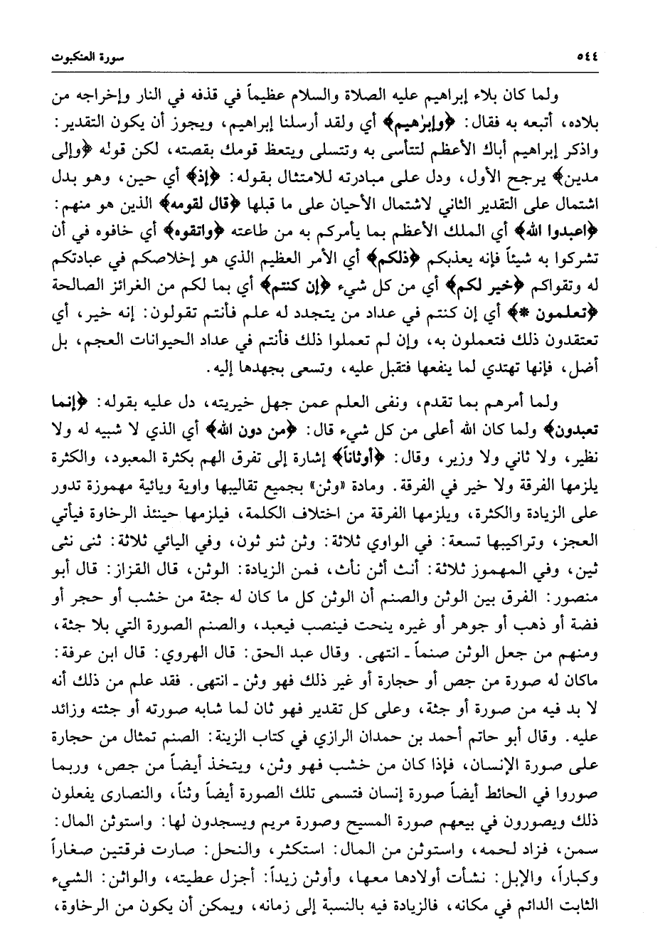 ولما كان بلاء إبراهيم عليه الصلاة والسلام عظيماُ في قذفه في النار وإخراجه من بلاده ، أتبعه بع فقال : ( وإبراهيم ) أي ولقد أرسلنا إبراهيم ، ويجوز أن يكون التقدير : واذكر إبراهيم أباك العظم لتتأسى به وتتسلى ويتعظ قومك بقصته ، لكن قوله ) وإلى مدين ( يرجح الأول ، ودل على مبادرته للمتثال بقوله : ( إذ ( اي حين ، وهو بدل اشتمال على التقدير الثاني لاشتمال الأحيان على ما قبلها ) قال لقومه ( الذين هو منهم : ( اعبدوا الله ) أي الملك الأعظم بما يأمركم به من طاعته ) واتقوه ) أي خافوه في أن تشركوا به شيئاً فإنه يعذبكم ) ذلكم ( اي الأمر العظيم الذي هو إخلاصكم في عبادتكم له وتقواكم ) خير لكم ) أي من كل شيء ) إن كنتم ) أي بما لكم من الغرائز الصالحة ) تعلمون ) أي إن كنتم في عداد الحيوانات العجم ، بل أضل ، فإنها تهتدي لما ينفعها فتقبل عليه ، وتسعى بجهدها إليه .