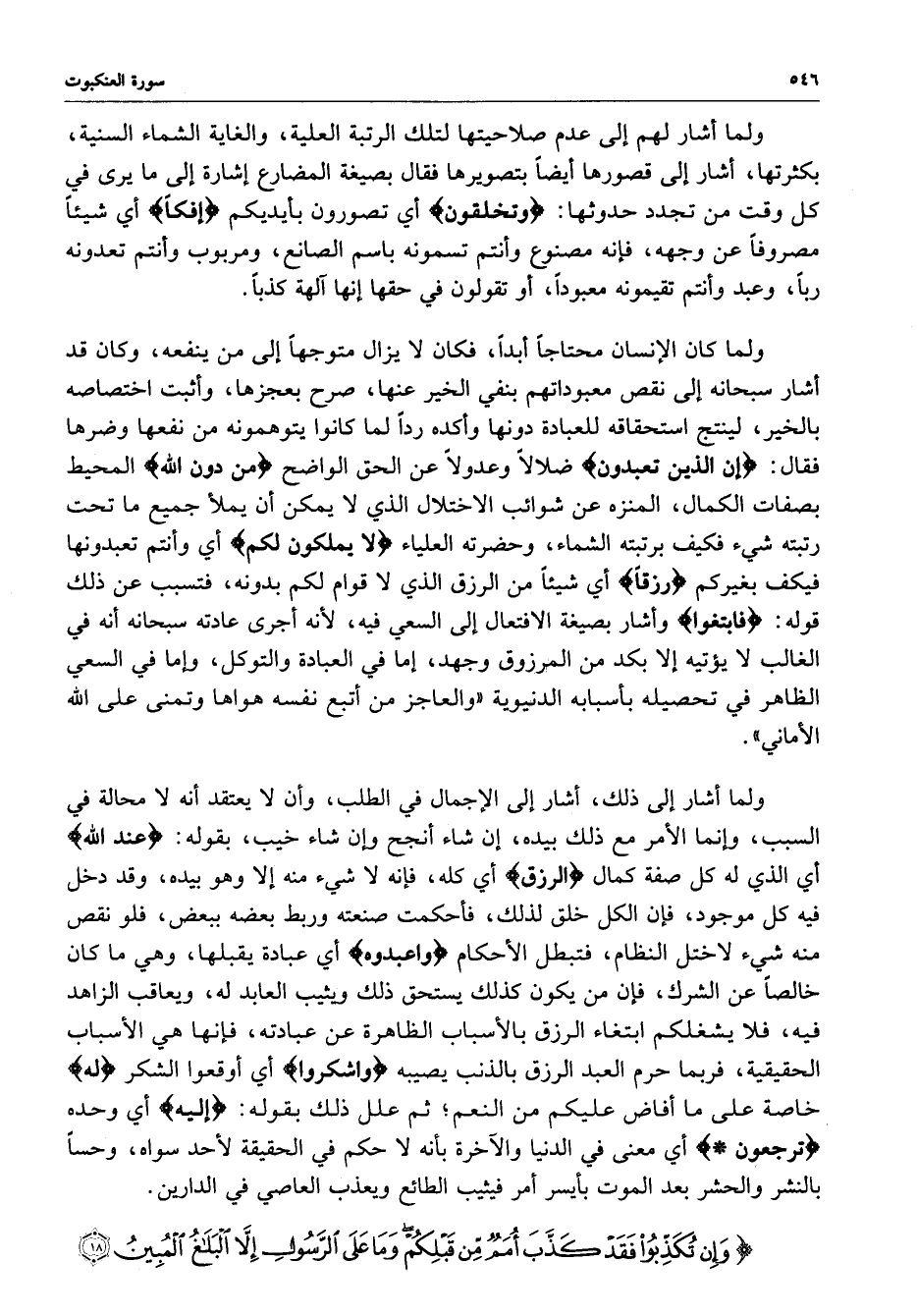 ولما اشار إلى ذلك ، اشار إل الإجمال في الطلب ، وأن لا يعتقد أنهلا محالة في السبب ، وإنما الأمر مع ذلك بيده ، إن شاء أنجح وإن شاء خيب ، بقوله : ( عند الله ) أي الذي له كل صفة كمال ) الرزق ( اي كله ، فغنه لا شيء منه إلا وهو بيده ، وقد دخل فيه كل موجود ، فإن الكل خلق لذلك ، فأحكمت صنعته وربط بعضه ببعض ، فلو نقص منه شيء لاختل النظام ، فتبطل الأحكام ) واعبدوه ( اي عبادة يبلهان وهي ما كان خالصاً عن الشرك ، فإن من يكون كذلك يستحق ذلك ويثيب العابد له ، ويعاقب الزاهد فيه ، فلا يشغلكم ابتغاء الرزق بالأسباب الظاهرة عن عبادته ، فإنها هي الأسباب الحقيقية ، فربما حرم العبد الرزق بالذنب يصيبه ) واشكروا ( اي اوقعوا الشكر ) له ( خاصة على ما أفاض عليكم من النعم ؛ ثم علل ذلك بقوله : ( إليه ) أي وحده ) ترجعون ( اي معنى في الدنيا والآخرة بأنه لا حكم في الحقيقة لأحد سواه ، وحساً بالنشر والحشر بعد الموت بأيسر أمر فيثيب الطائع ويعذب العاصي في الدارين .
