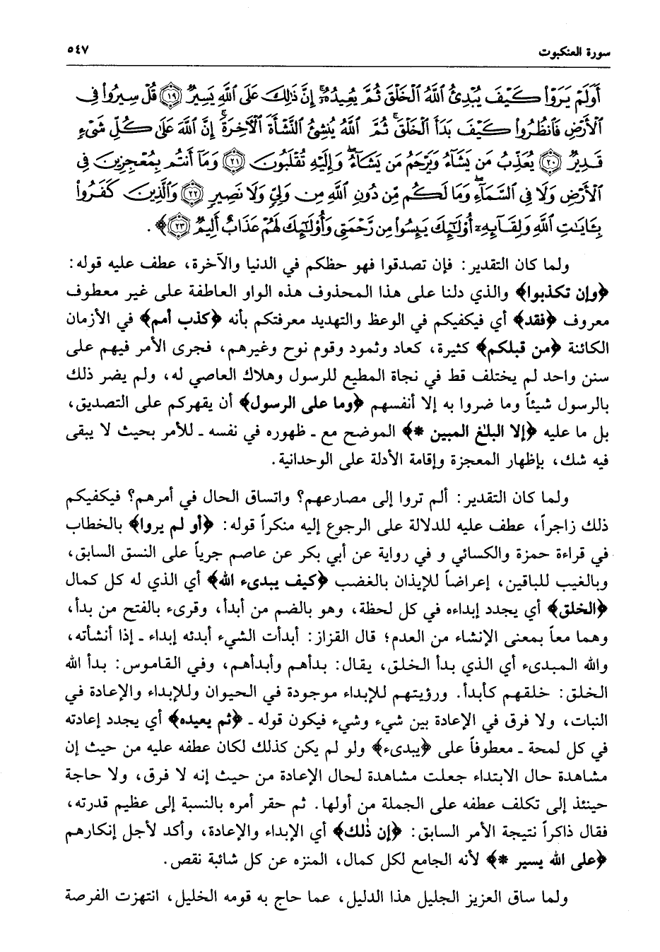 ) وَإِن تُكَذِّبُواْ فَقَدْ كَذَّبَ أُمَمٌ مِّن قَبْلِكُمْ وَمَا عَلَى الرَّسُولِ إِلاَّ الْبَلاَغُ الْمُبِينُ أَوَلَمْ يَرَوْاْ كَيْفَ يُبْدِيءُ اللَّهُ الْخَلْقَ ثُمَّ يُعِيدُهُ إِنَّ ذلِكَ عَلَى اللَّهِ يَسِيرٌ قُلْ سِيرُواْ فِي الأَرْضِ فَانظُرُواْ كَيْفَ بَدَأَ الْخَلْقَ ثُمَّ اللَّهُ يُنشِىءُ النَّشْأَةَ الآخِرَةَ إِنَّ اللَّهَ عَلَى كُلِّ شَيْءٍ قَدِيرٌ يُعَذِّبُ مَن يَشَآءُ وَيَرْحَمُ مَن يَشَآءُ وَإِلَيْهِ تُقْلَبُونَ وَمَآ أَنتُمْ بِمُعْجِزِينَ فِي الأَرْضِ وَلاَ فِي السَّمَآءِ وَمَا لَكُمْ مِّن دُونِ اللَّهِ مِن وَلِيٍّ وَلاَ نَصِيرٍ وَالَّذِينَ كَفَرُواْ بِآيَاتِ اللَّهِ وَلِقَآئِهِ أُوْلَئِكَ يَئِسُواْ مِن رَّحْمَتِي وَأُوْلَئِكَ لَهُمْ عَذَابٌ أَلِيمٌ ( ( )