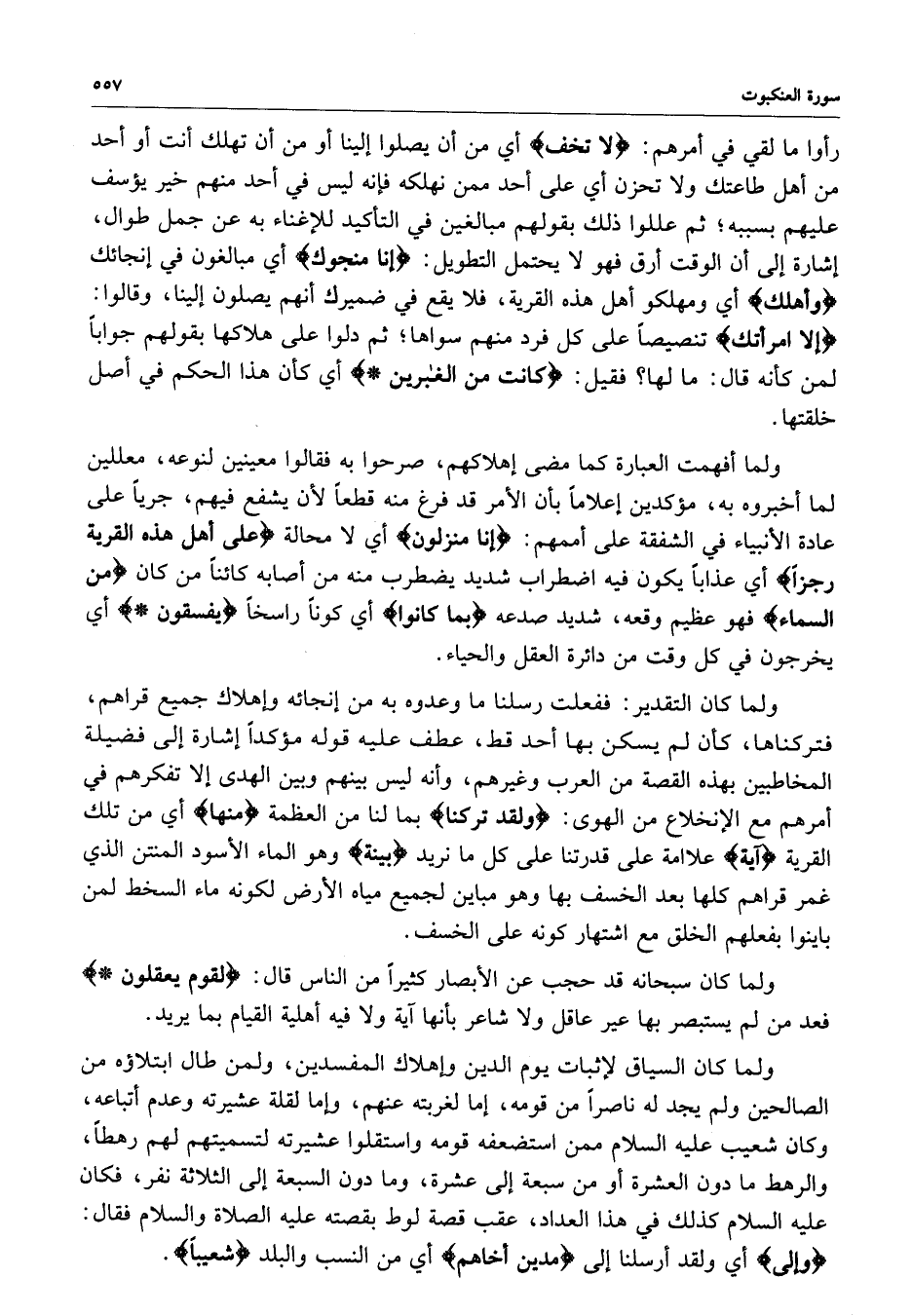 رأوا ما لقي في أمرهم : ( لا تخف ) أي من أن يصلوا إلينا أو من أن تهلك أنت أو أحد من أهل طاعتك ولا تحزن أي على أحد ممن نهلكه فإنه ليس في أحد منهم خير يؤسف عليهم بسببه ؛ ثم عللوا ذلك بقولهم مبالغين في التأكيد للإغناء به عن جمل طوال ، إشارة إلى ان الوقت أرق فهو لا يحتمل التطويل : ( إنا منجوك ) أي مبالغون في إنجائك ) وأهلك ) أي ومهلكوا أهل هذه القرية ، فلا يقع ضميرك أنهم يصلون إلينا ، وقالوا : ( إلا امرأتك ( تنصيصاً على كل فرد منهم سواها ؛ ثم دلوا على هلاكها بقولهم جواباً لمن كأنه قال : ما لها ؟ فقيل : ( كانت من الغابرين ( اي كأن هذا الحكم في أصل خلقتها .