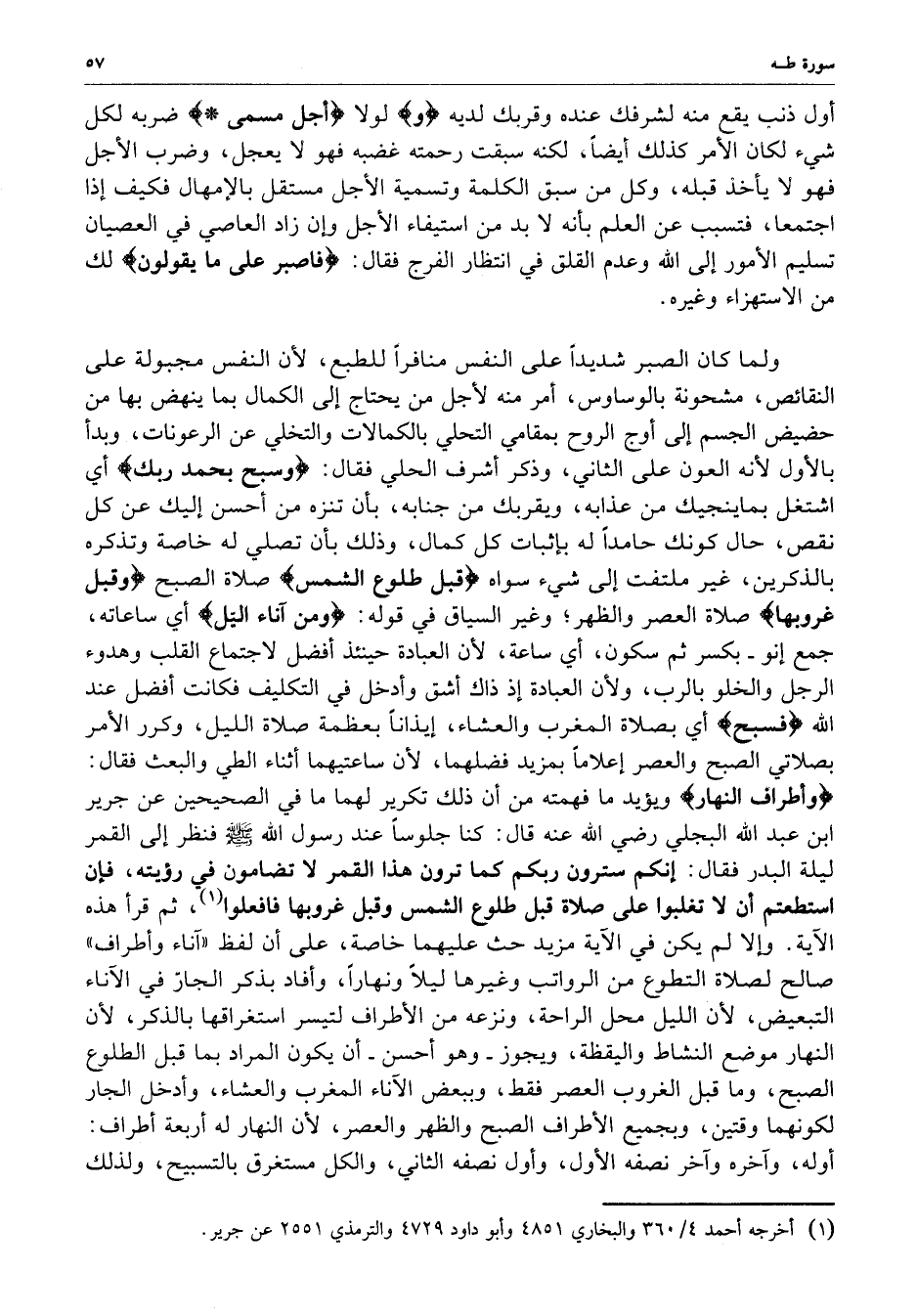 ولما كان الصبر شديداً على النفس منافراً للطبع ، لأن النفس مجبولة على النقائص ، مشحونة بالوسواس ، أمر منه لأجل من يحتاج إلى الكمال بما ينهض بها من حضيض الجسم إلى أوج الروح بمقامي التحلي بالكمالات والتخلي عن الرعونات ، وبدأ بالأول لأنه العون على الثاني ، وذكر أشرف الحلي فقال : ( وسبح بحمد ربك ( اي اشتغل بماينجيك من عذابه ، ويقربك من جنابه ، بأن تنزه من أحسن إليك عن كل نفص ، حال كونك حامداً له بإثبات كل كمال ، وذلك بأن تصلي له خاصة وتذكره بالذاكرين ، غير ملتفت إلى شيء سواه ) قبل طلوع الشمس ( صلاة الصبح ) وقبل غروبها ( صلاة العصر والظهر ؛ وغير السياق في قوله : ( ومن آناء اليّل ( اي ساعاته ، جمع إنو - بكسر ثم سكون ، أي ساعة ، لأن العبادة حينئذ أفضل لاجتماع القلب وهدوء الرجل والخلو بالرب ، لأن العبادة إذ ذاك أشق وأدخل في التكليف فكانت افضل عند الله ) فسبح ) أي بصلاة المغرب والعشاء ، إيذاناً بعظمة صلاة الليل ، وكرر الأمر بصلاتي الصبح والعصر إعلاماً بمزيد فضلهما ، لأن ساعتيها أثناء الطي والبعث فقال : ( وأطاف النهار ( ويؤيد ما فهمته من أن ذلك تكرير لهما ما في الصحيحين عن جرير ابن عبد الله البجلي رضي الله عنه قال : كنا جلوساً عند رسول الله ( صلى الله عليه وسلم ) فنظر إلى القمر ليلة البدر فقال : ( إنكم سترون ربكم كما ترون هذا القمر لا تضامون في رؤيته ، فإن استطعتم أن لا تغلبوا على صلاة قبل طلوع الشمس وقبل غروبها فافعلوا ) ، ثم قرأ هذه الاية .