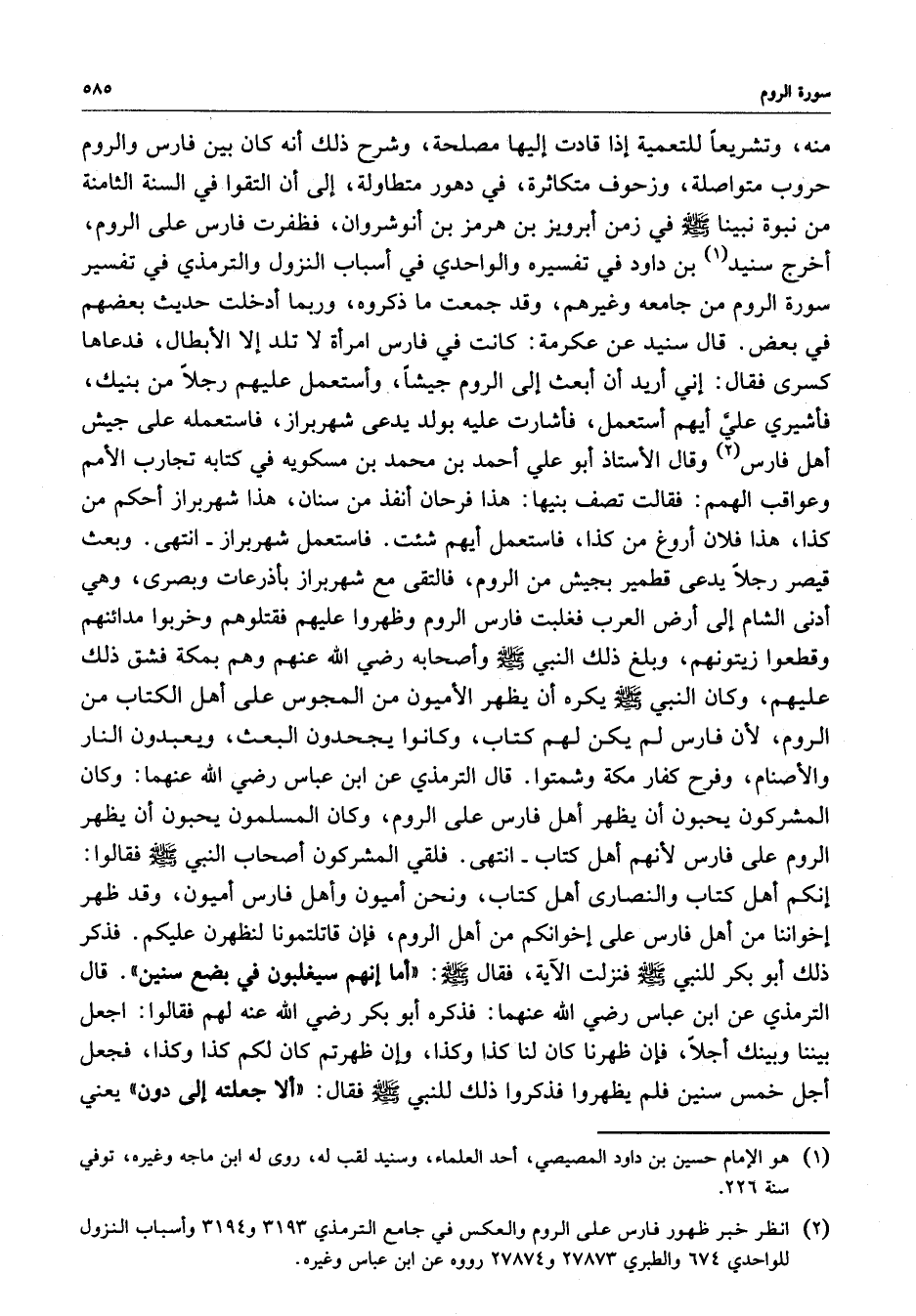 منه ، وتشريعاً للتعمية إذا قادت إليها مصلحة ، وشرح ذلك أنه كان بين فارس والروم حروب متواصلة ، وزحوف متكاثرة ، في دهور متطاولة ، إلى أن التقو في السنة الثامنة من نبوة نبينا محمد صلى الله عليهوسلم في زمن أبرويز بن هرمز بن أنوشروان ، فظفرت فارس على الروم ، أخج سنيد بن داود في تفسيره والواحدي في أسباب النزول والترميذي في تفسير سورة الروم من جامعة وغيرهم ، وقد جمعت ما ذكروه ، وبما دخلت حديث بعضهم في بعض .