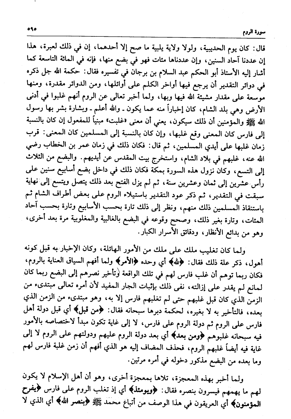 قال : يوم الحديبية ، ولولا ولاية يلبيه ما صح إلا أحدهما ، إن في ذلك لعبرة ، هذا إن عددنا آحاد السنين ، وإن عددناها مئات فهو في بضع منها ، فإنه في المائة التاسعة كما اشار إليه الأستاذ أبو الحكم عبد السلام بن برجان في تفسيره فقال : حكمة الله جل ذكره في دوئر التقدير أن يرجع فيها أواخر الكلم عن أوائلها ، ومن الدوائر مقدرةن ومنها موسعة على مقدرا مشيئة الله فيها وبها ، ولما اخبر الله تعالى عن الروم أنهم غلبوا في أدنى الأرض وهي بلد الشام ، كان إخباراً منه عما يكون - والله أعلم - وبشارة بشر بها رسول الله ( صلى الله عليه وسلم ) والمؤمنين أن ذلك سيكون ، يعني أن معنى ( غلبت ) مبنياً للمفعول إن كان بالنسبة غلى فارس كان المعنى وقع غلبها ، وإن كان بالنسبة للمسلمين كان المعنى : قرب زمان غلبها على أيدي المسلمينن ثم قال : فكان ذلك في زمان عمر بن الخطاب رضي الله عنه ، غلبهم في بلاد الشام ، و استخرج بيت المقدس عن أيديهم .